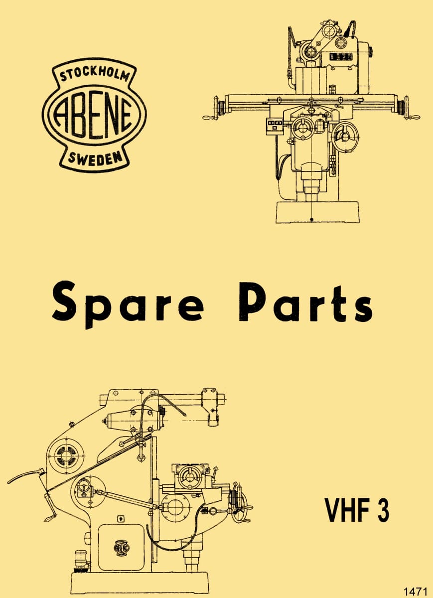 This is a reproduction, not a photocopy, of an original Abene of Stockholm Sweden VHF-3 Horizontal/Vertical Milling Machine Parts Manual. This Abene manual contains cross-sectional view diagrams of all the parts with parts list and descriptions for this mill.