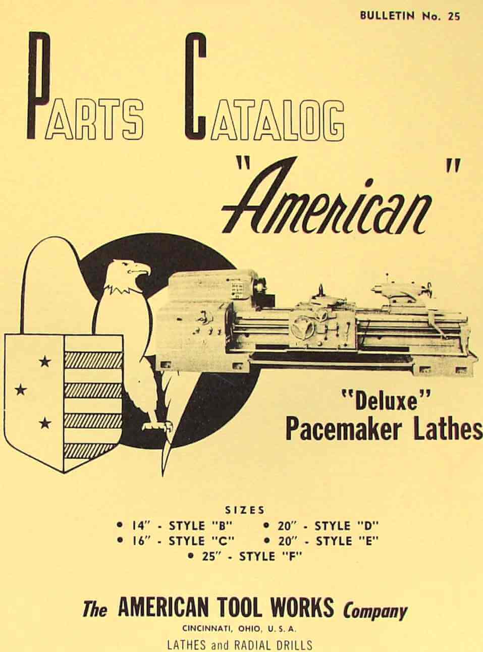 This is a reproduction, not a photocopy, of an original American Tool Works “Deluxe” Pacemaker Lathe Parts Manual.This covers the 14″-B, 16″-C, 20″-D, 20″-E and 25″-F lathes. The parts diagrams for this manual are excellent and very detailed.