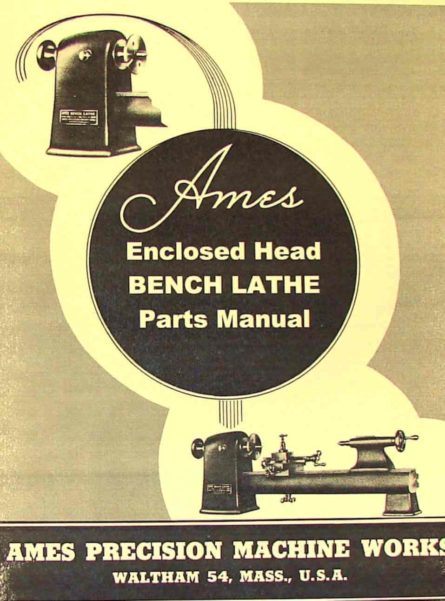 This is a reproduction, not a photocopy, of an original Ames Enclosed Head Bench Lathe Parts Manual. This manual contains parts diagrams for the A-6000 headstock with 1″ capacity, the A-2300 compound slide rest, and the A-6100 tailstock. There are also a couple of pages on accessories for the headstock and tailstock. The lathe was originally covered in three different manuals. I’ve collected all the different manuals and combined them together here. The manuals are hard to come by in a full set, and there weren’t a lot of these lathes made.