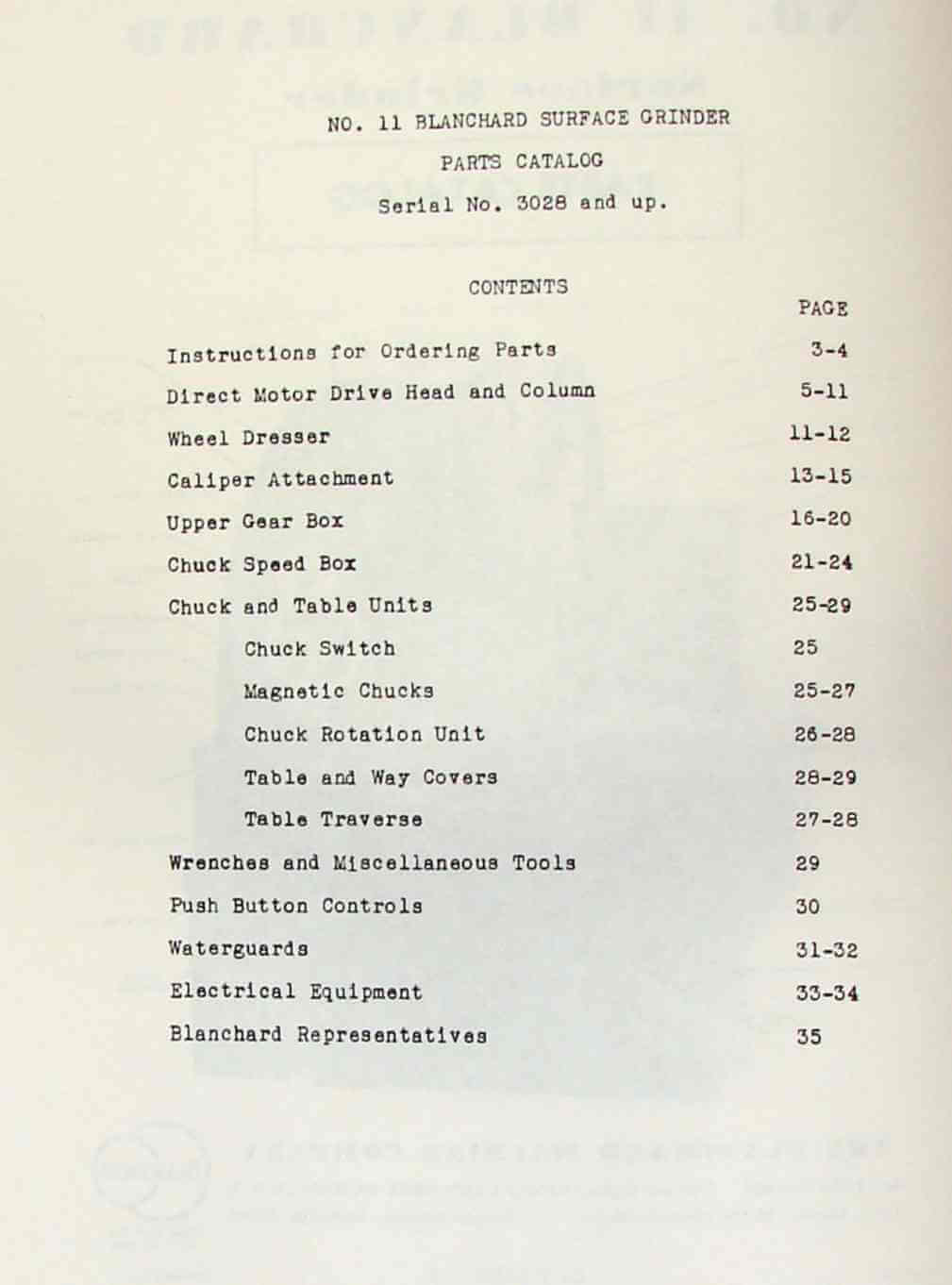 Instructions for Ordering Parts.......3-4 Direct Motor Drive Head and Column...5-11 Wheel Dresser.......................11-12 Caliper Attachment..................13-15 Upper Gear Box......................16-20 Chuck Speed Box.....................21-24 Chuck and Table Units...............25-29 Chuck Switch...........................25 Magnetic Chucks.....................25-27 Chuck Rotation Unit.................26-28 Table and Way Covers................28-29 Table Traverse......................27-28 Wrenches and Miscellaneous Tools.......29 Push Button Controls...................30 Waterguards.........................31-32 Electrical Equipment................33-34 Blanchard Representatives..............35