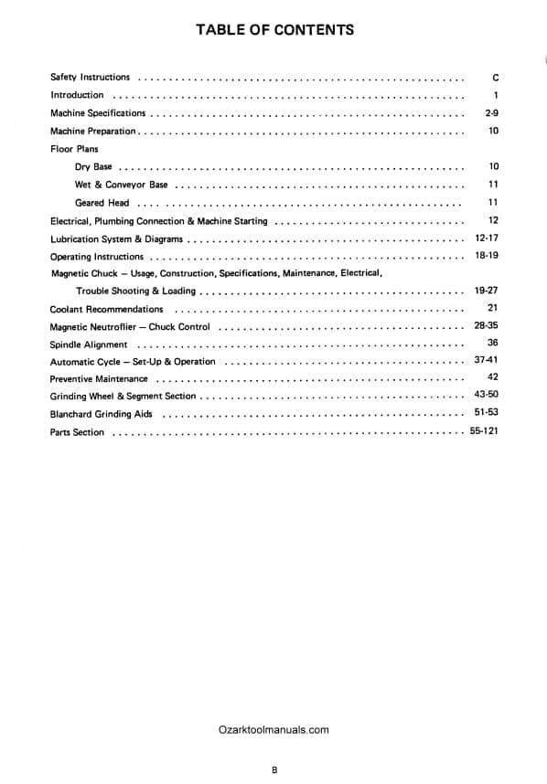 This is a reproduction, not a photocopy, of an original Blanchard No. 18, 20, 22 & 26 Series Surface Grinder Operator’s,Maintenance and Parts Manual printed in 1973. This manual contains information on the different machine specifications and layout, setting up the surface grinder, adjustments, lubrication, truing the chuck, and proper grinding wheel selection. The Blanchard manual also has steps for locating a fault in the chuck circuit, plus installing and operating the neutrofier, with wiring diagrams. This Blanchard manual also contains explosive view diagrams of all the parts with parts list and descriptions.