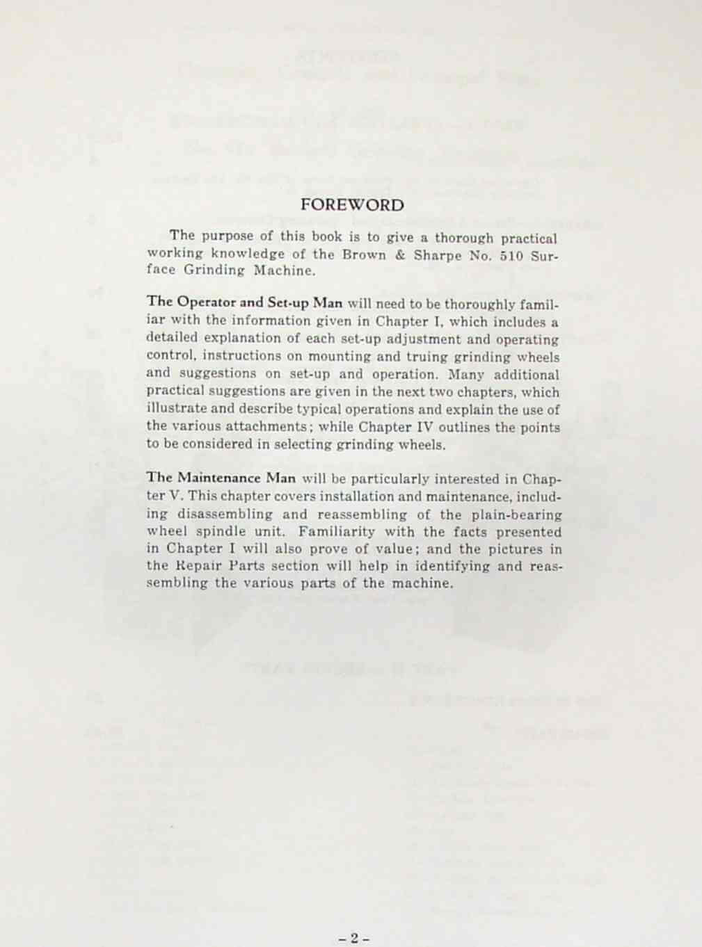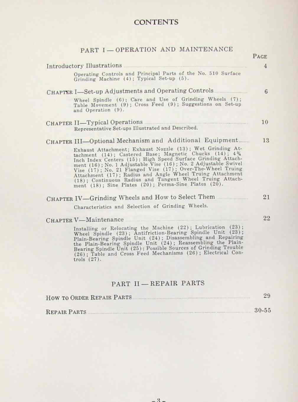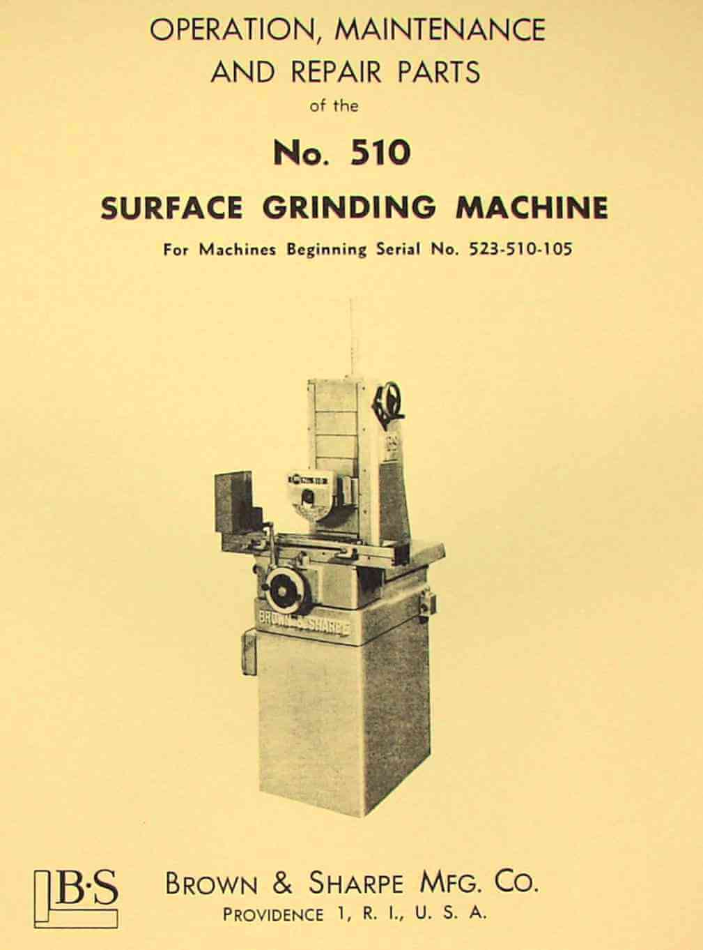 This is a reproduction, not a photocopy, of an original Brown & Sharpe Operation, Maintenance and Repair Parts for 510 Surface Grinding Machine. This manual covers machines beginning with serial No. 523-510-105. This manual can still be helpful to Brown and Sharpe surface grinders that look similar to this machine and are close to this serial number. This manual contains information on lubrication, maintenance, and controls as well as a complete parts list and exploded views and adjustments. This manual has it all. It covers operations of the machine and setups for grinding which is covered in 27 pages. There is also a great parts section.