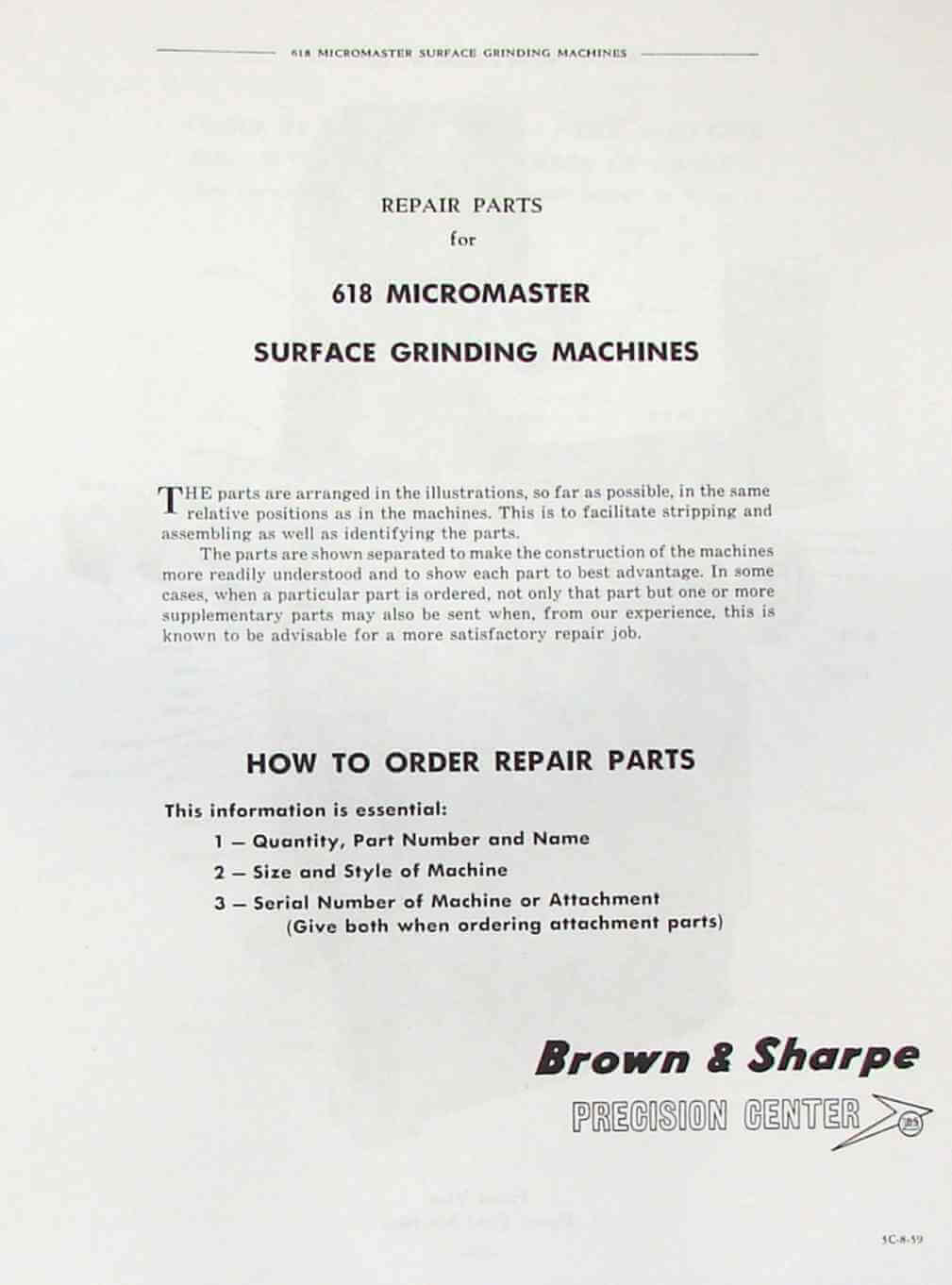 BROWN & SHARPE 618 Micromaster Surface Grinder Parts Manual