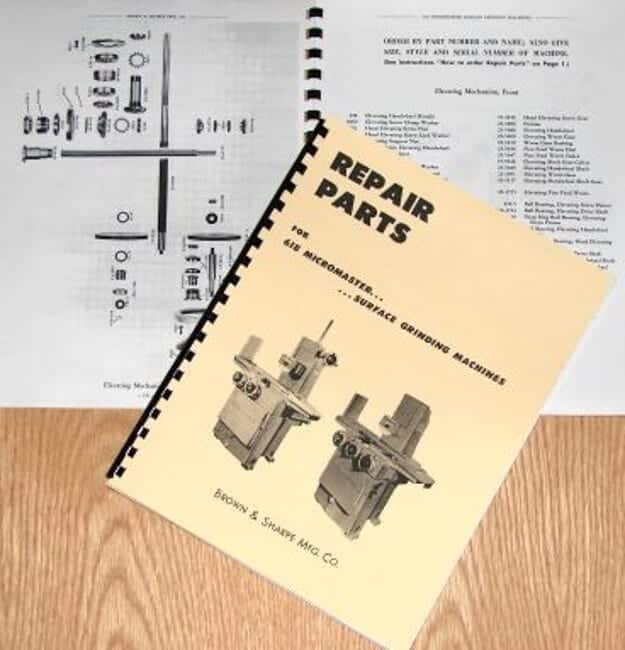 This is a reproduction, not a photocopy, of an original Brown and Sharpe 618 Micromaster Surface Grinder Parts Manual. This manual contains pictorial images of the parts with descriptions as shown in the picture above.