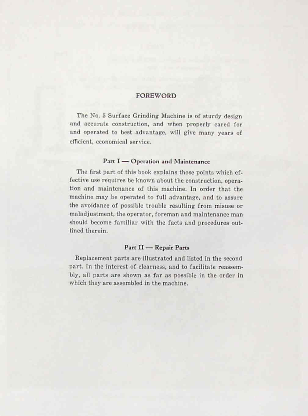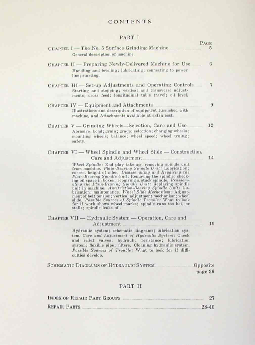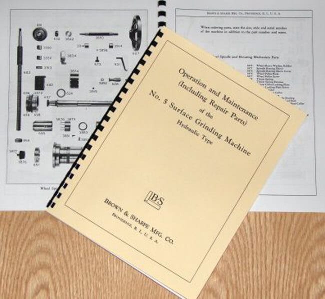 This is a reproduction, not a photocopy, of an original Brown & Sharpe No. 5 Surface Grinder Machine (Hydraulic Type) Operation, Maintenance, and Parts Manual. This manual contains information on lubrication, maintenance, adjustments, operations, and controls. It also contains pictorial views of the parts for the machine. Please read contents below.