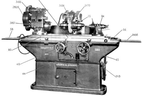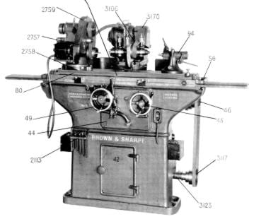 This is a reproduction, not a photocopy, of an original Brown & Sharpe Nos. 1, 2, 3, and 4 Universal Grinding Machines Parts Manual for both motor and overhead driven models. This manual contains pictorial views of all the parts with parts descriptions.