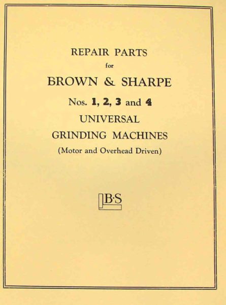 This is a reproduction, not a photocopy, of an original Brown & Sharpe Nos. 1, 2, 3, and 4 Universal Grinding Machines Parts Manual for both motor and overhead driven models. This manual contains pictorial views of all the parts with parts descriptions.