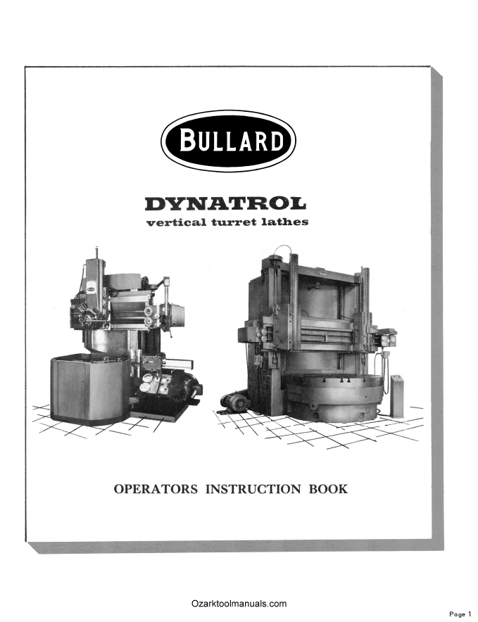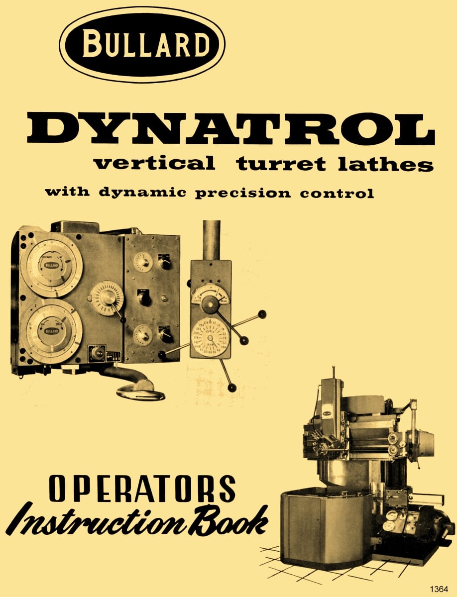 This is a reproduction, not a photocopy, of an original Bullard Dynatrol Vertical Turret Lathe (VTL) Operators Instruction Book Manual. This covers the Bullard Dynatrol VTLs with the dynamic precision control. The manual labels all the different controls and features on these VTLs. It provides proper startup and operating procedures, and explains all the different controls. The manual also covers the Size-Au-Trol which converts a manually operated machine into a semi-automatic one. It also includes information on cutting threads with the thread cutting charts for both English and metric threads.