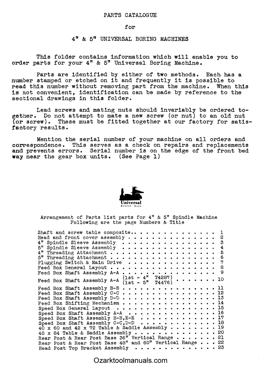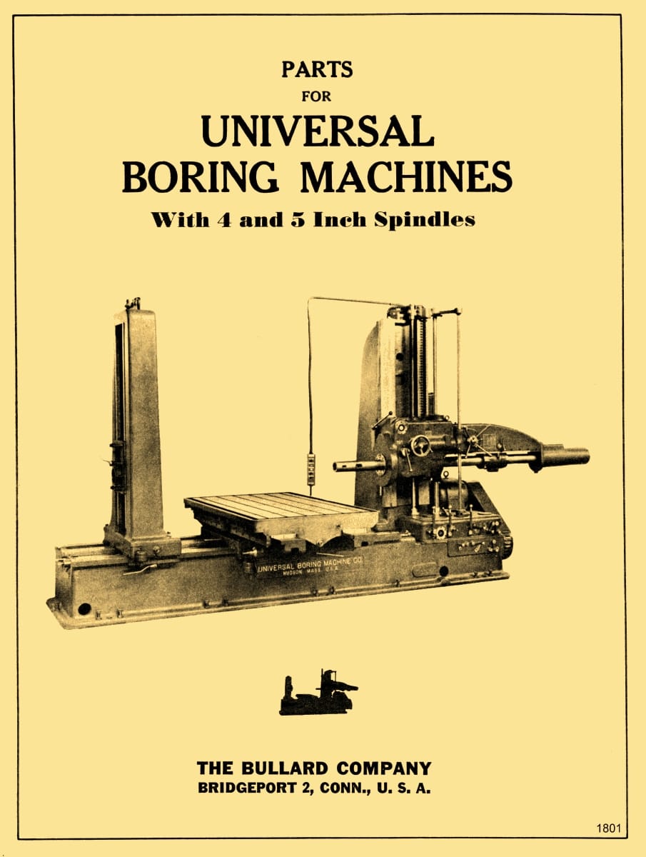 This is a reproduction, not a photocopy, of an original Bullard Universal Horizontal Boring Drilling & Milling Machine with a 4-inch or 5-inch Spindle Parts Manual. These were originally the Universal Boring Machine Co., and Bullard bought them out. This manual has twenty-three 11″ x 17″ foldouts with clear cross-sectional view diagrams of all the parts. The parts descriptions are very basic, but they will help you understand the diagram and how the machine goes together properly for these old horizontal boring mills.