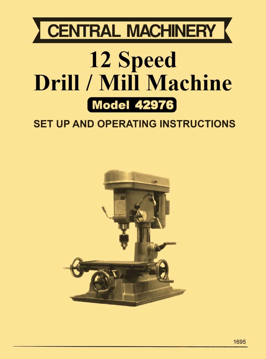 This is a reproduction, not a photocopy, of an original Harbor Freight Central Machinery 12-Speed Drill/Milling Machine Model 42976 Instructions, Operator’s, Owner’s, and Parts Manual. This mill manual contains information about the milling machine specifications, installation, lubrication, changing spindle speeds, and proper operating instructions. The manual includes instructions for changing the chuck and making adjustments to compensate for wear. It also has a wiring diagram and a troubleshooting guide. There are explosive view diagrams of all the parts with a parts list for this Central Machinery 42976 milling machine.
