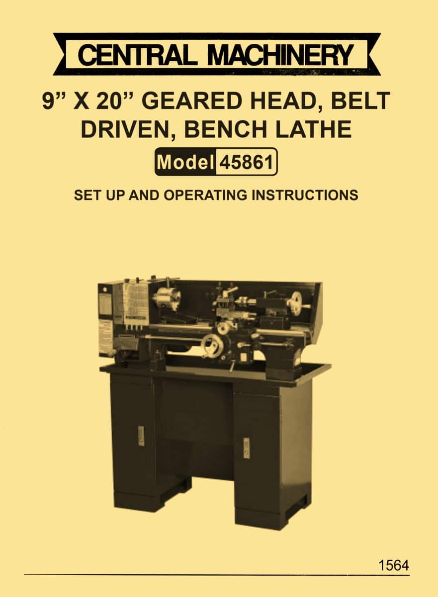 This is a reproduction, not a photocopy, of an original Harbor Freight Central Machinery 9″ x 20″ Metal Lathe Model 45861 Owner, Operator and Parts Manual. This manual contains the metal lathe specifications, safety instructions, operating instructions, and maintenance. This Central Machinery manual also has instructions for lubrication and wiring diagrams. It also has explosive view diagrams of all the parts with parts list and descriptions for this Central Machinery metal lathe.
