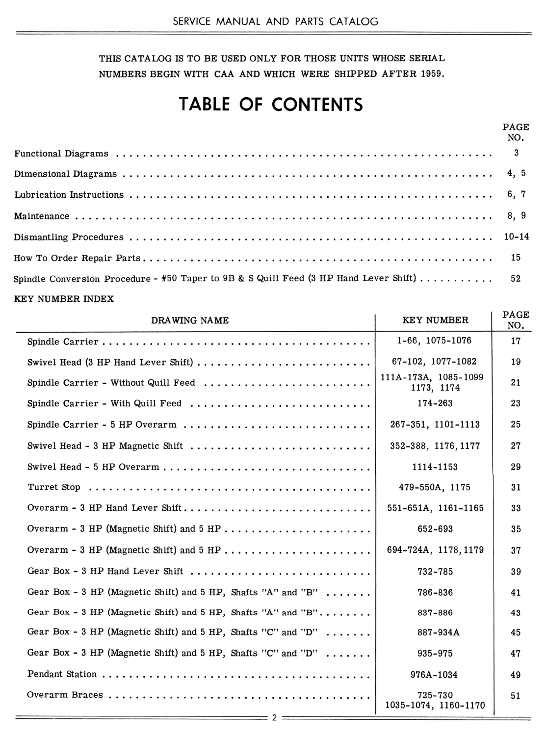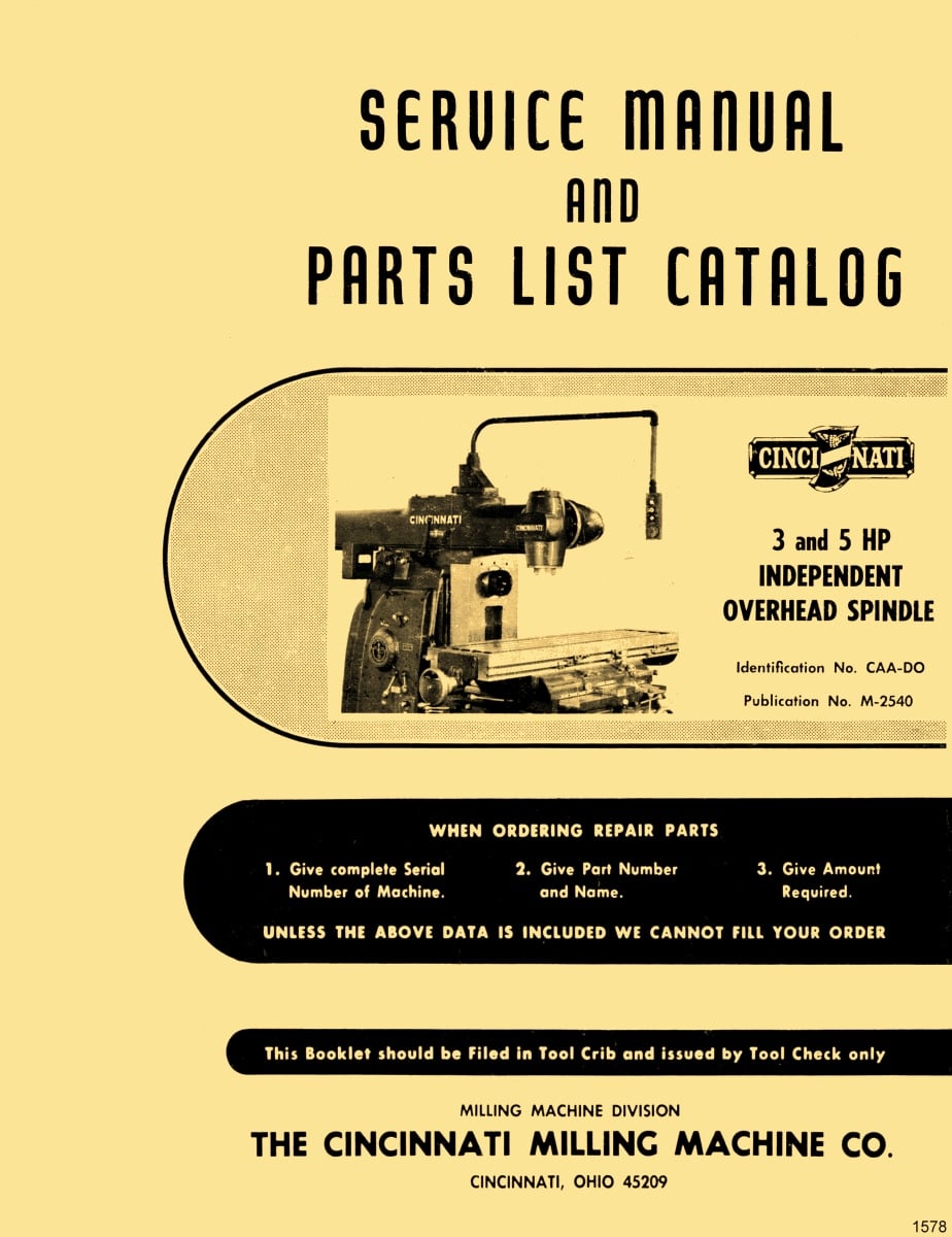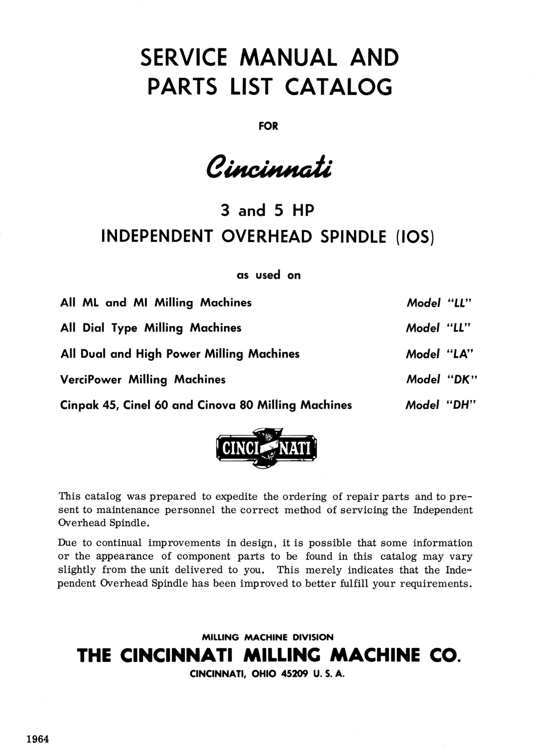 This is a reproduction, not a photocopy, of an original 1964 Cincinnati 3 and 5 HP Independent Overhead Spindle for Service and Parts Manual. This manual covers the independent overhead spindle that fits on all ML, MI, Dial Type, Dual and High Power, VerciPower, Cinpak 45, Cincel 60 and Cinova 80 milling machines. If you need information on those machines, we have separate manuals for those.