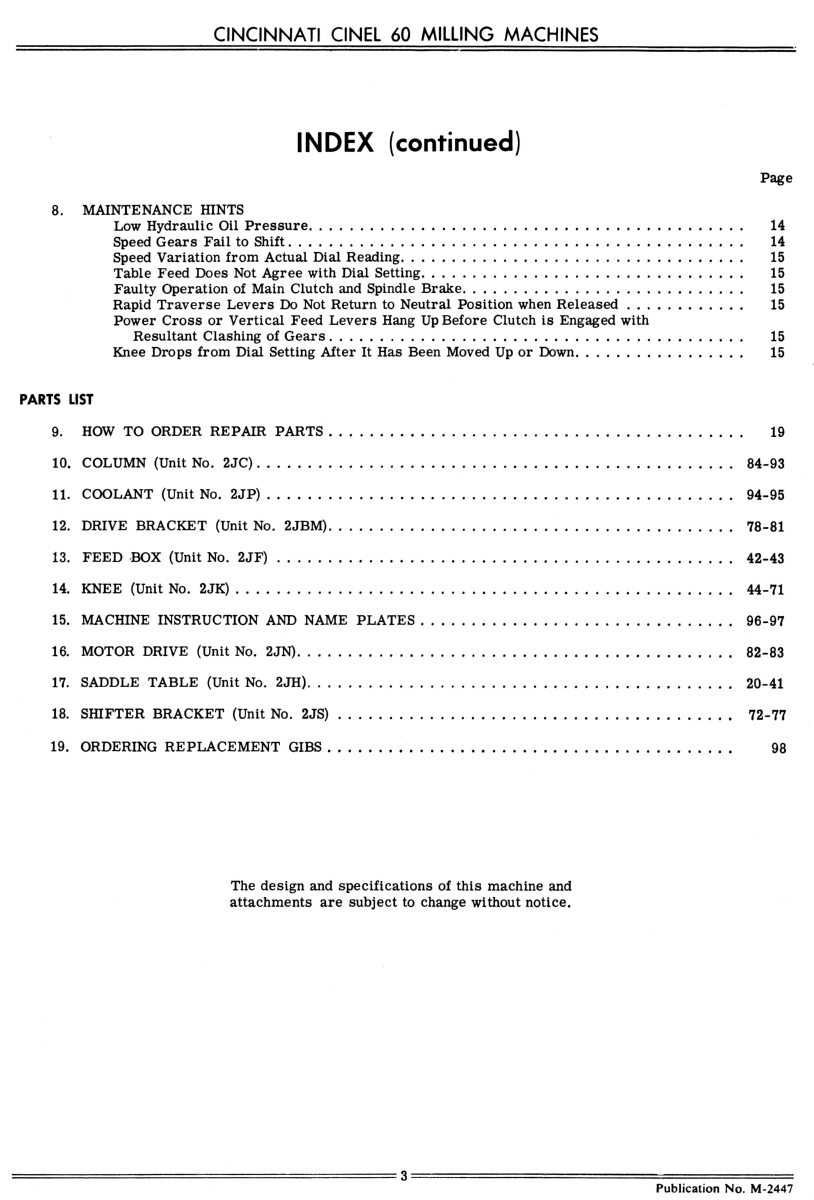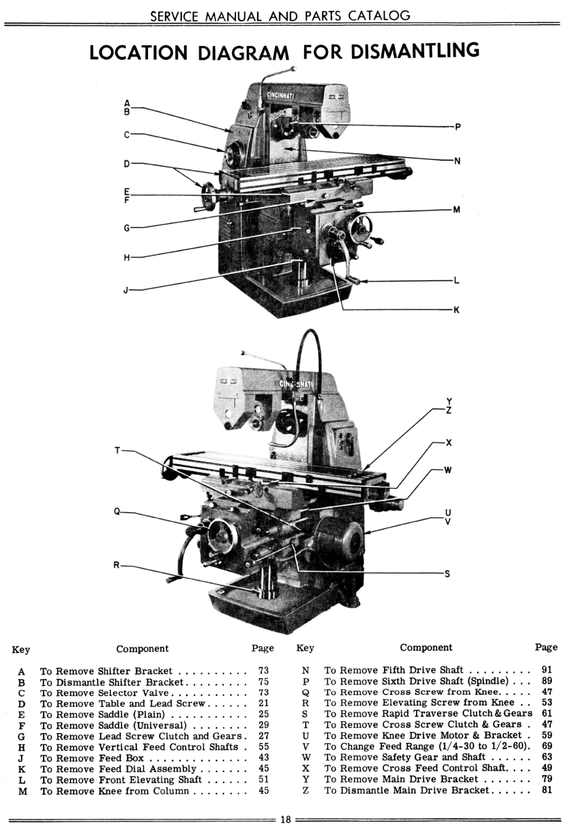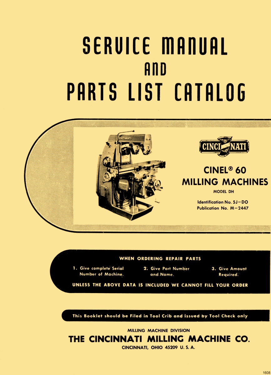 This is a reproduction, not a photocopy, of an original 1964 Cincinnati Cinel 60 Horizontal Milling Machine Model DH Service and Parts Manual which begins with serial number 5J. This manual contains step-by-step instructions on how to dissemble and service almost every part of this milling machine. The manual has clear explosive view diagrams of all the parts with parts numbers and descriptions.
