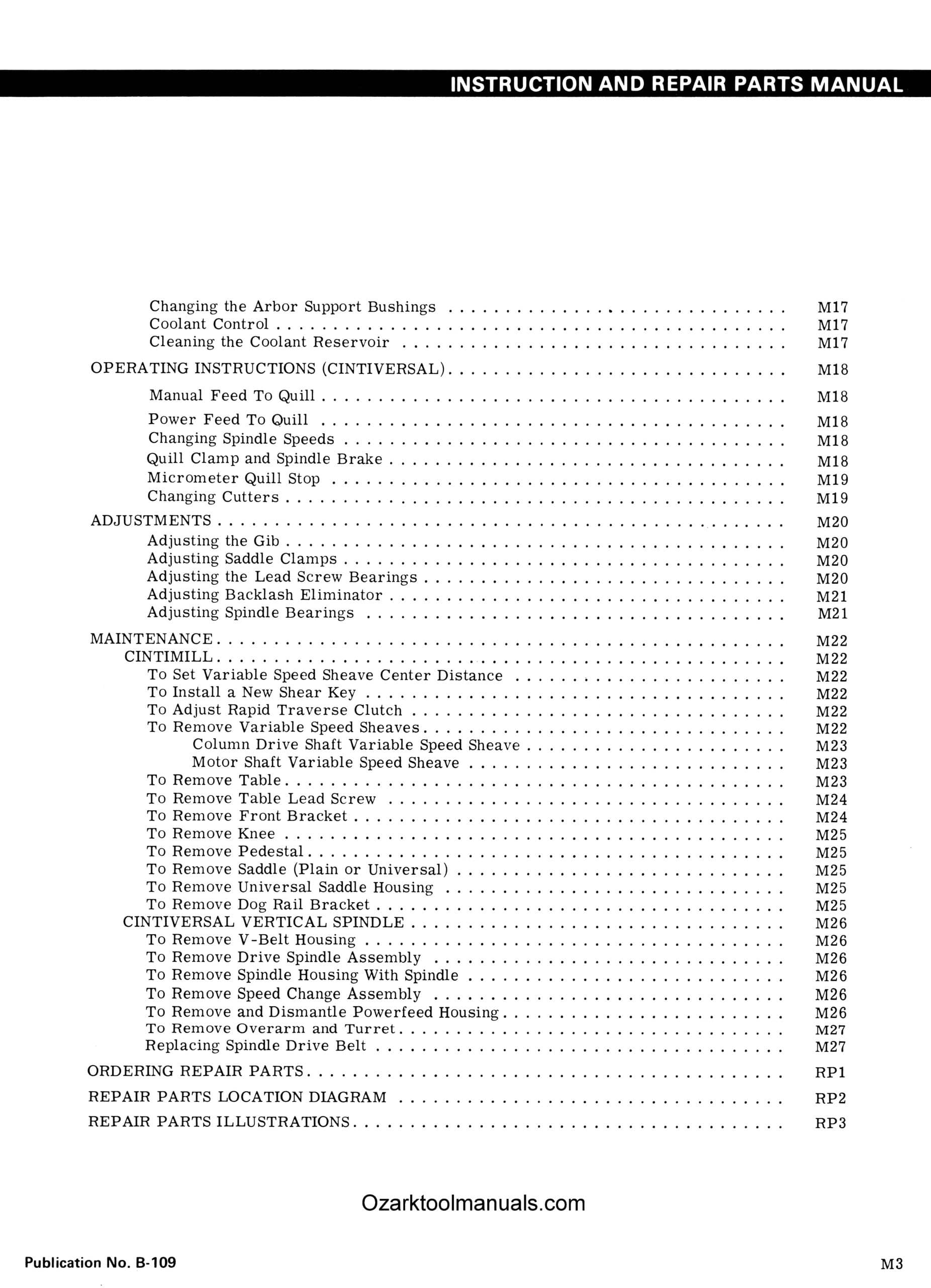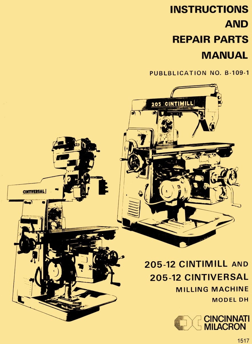 This is a reproduction, not a photocopy, of an original Cincinnati Milacron CINTIMILL and CINTIVERSAL 205-12 model DH Horizontal and Vertical Milling Machines Instructions Service & Repair Parts Manual. This manual contains the mill dimensions and installation instructions for both the plain and universal models. The mill manual includes lubrication and maintenance instructions. It shows how to properly operate these mills, and shows how to make various adjustments. For example, it shows how to adjust the spindle bearings, the backlash eliminator, and the traverse clutch. The manual also includes a lot of clear explosive view diagrams of all the different parts for these Cincinnati CINTIMILL and CINTIVERSAL Milling Machines with parts list.