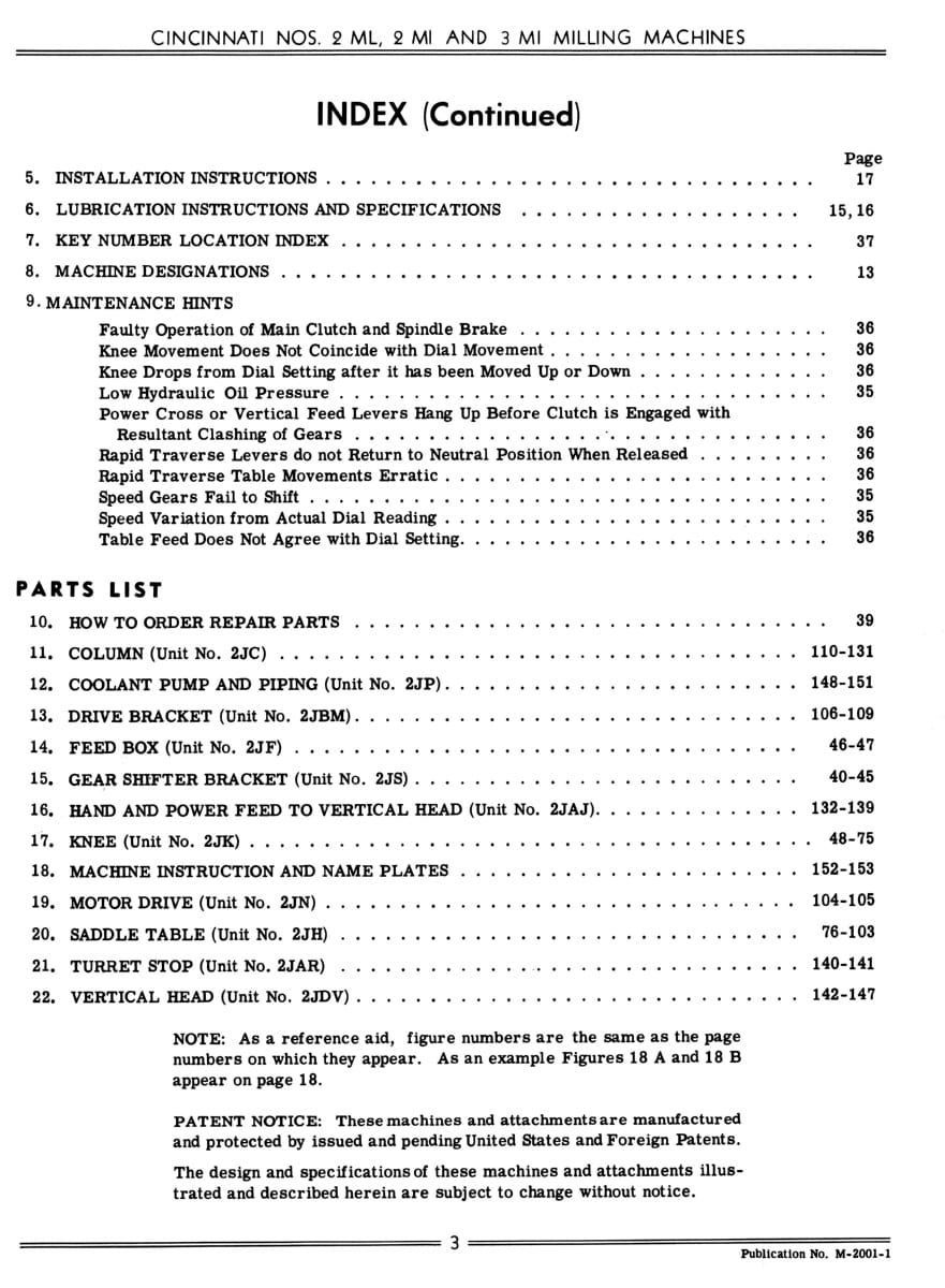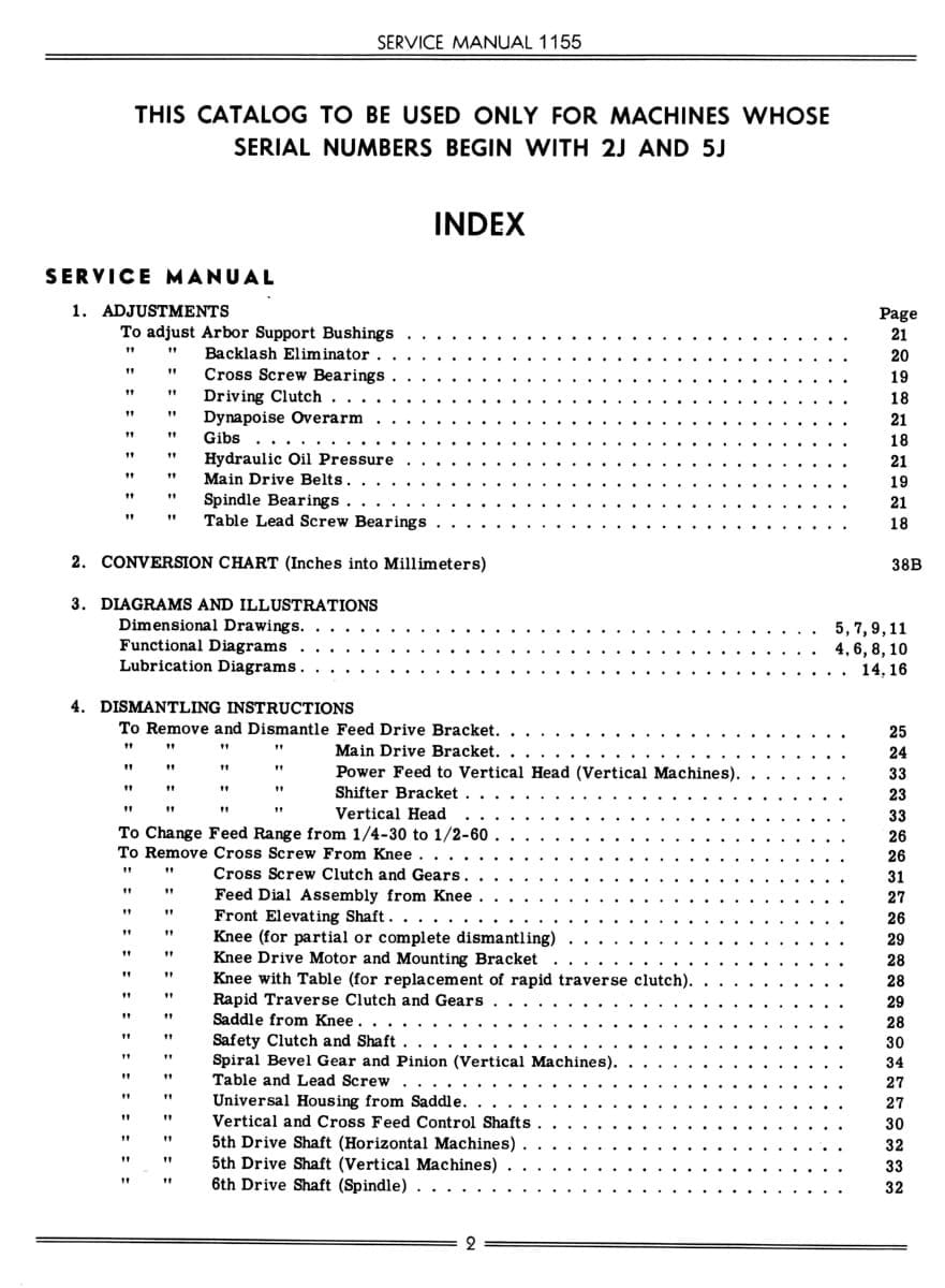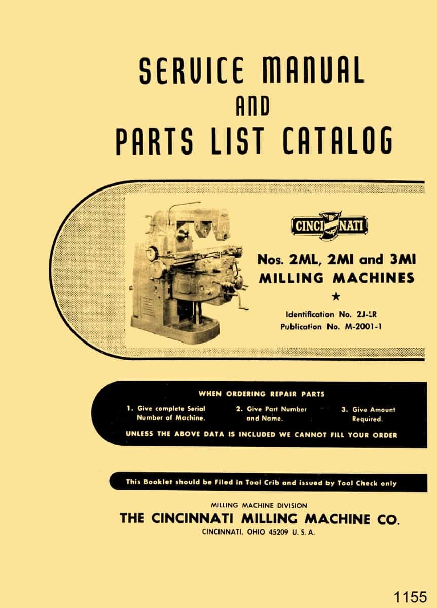 This manual covers Cincinnati milling machines whose serial number begins with “2J” and “5J”. According to Cincinnati “the general design and operation of the Cincinnati Nos. 2LR and 2MS milling machines are identical to that of the Cincinnati Nos. 2ML and 2MI milling machines.”