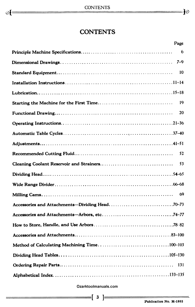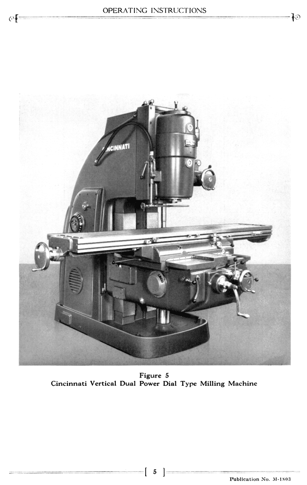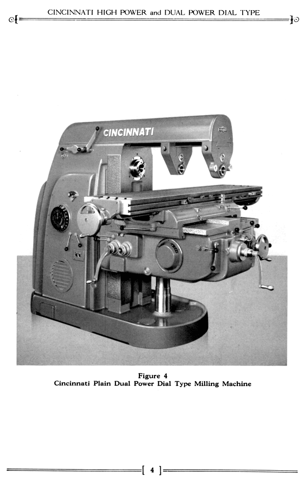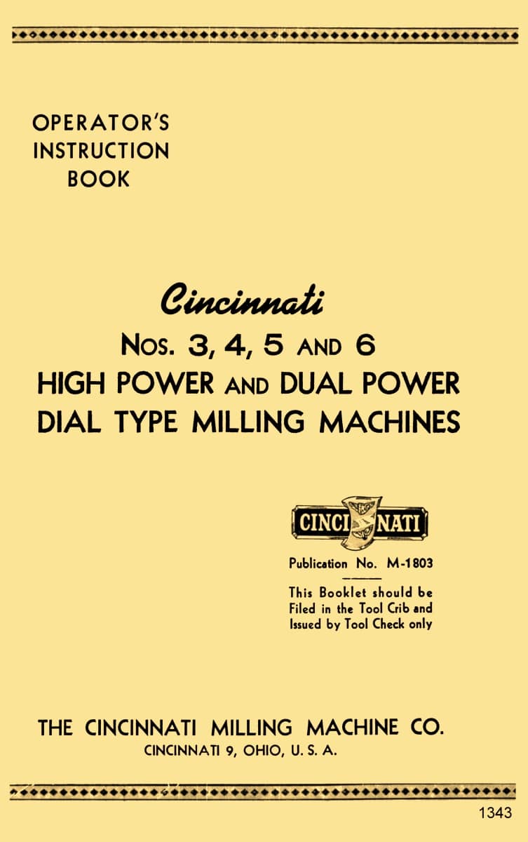 This is a reproduction, not a photocopy, of an original 1951 Cincinnati Nos. 3, 4, 5, 6 High Power & Dual Power Horizontal Vertical Milling Machines Owner Operator’s Instructions Manual. This manual contains milling machine specifications, operating instructions, adjustments, and maintenance for these Cincinnati Milling Machines. The manual covers how to properly lubricate these mills, and how to set up the automatic table cycles. It shows and describes how to adjust about everything on these milling machines including the main drive clutch, spindle bearings, and main screw bearings. It also covers a lot of the attachments that were available for these mills. It shows how to set them up and use them. Please see the pictures above for the index of contents, and pictures of the type of mills covered in this manual.
