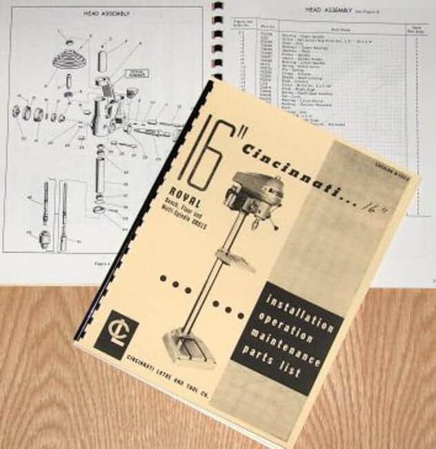 This is a reproduction, not a photocopy, of an original Cincinnati 16 inch Royal Drill Press Operations, Maintenance, and Parts manual. This manual contains 6 pages with information on set up, lubrication, maintenance, adjustments, and controls as well 17 pages of parts list and diagrams. The parts include accessories like the coolant pump, seventeen speed attachment, footlever feed attachment, and the mortising attachment.
