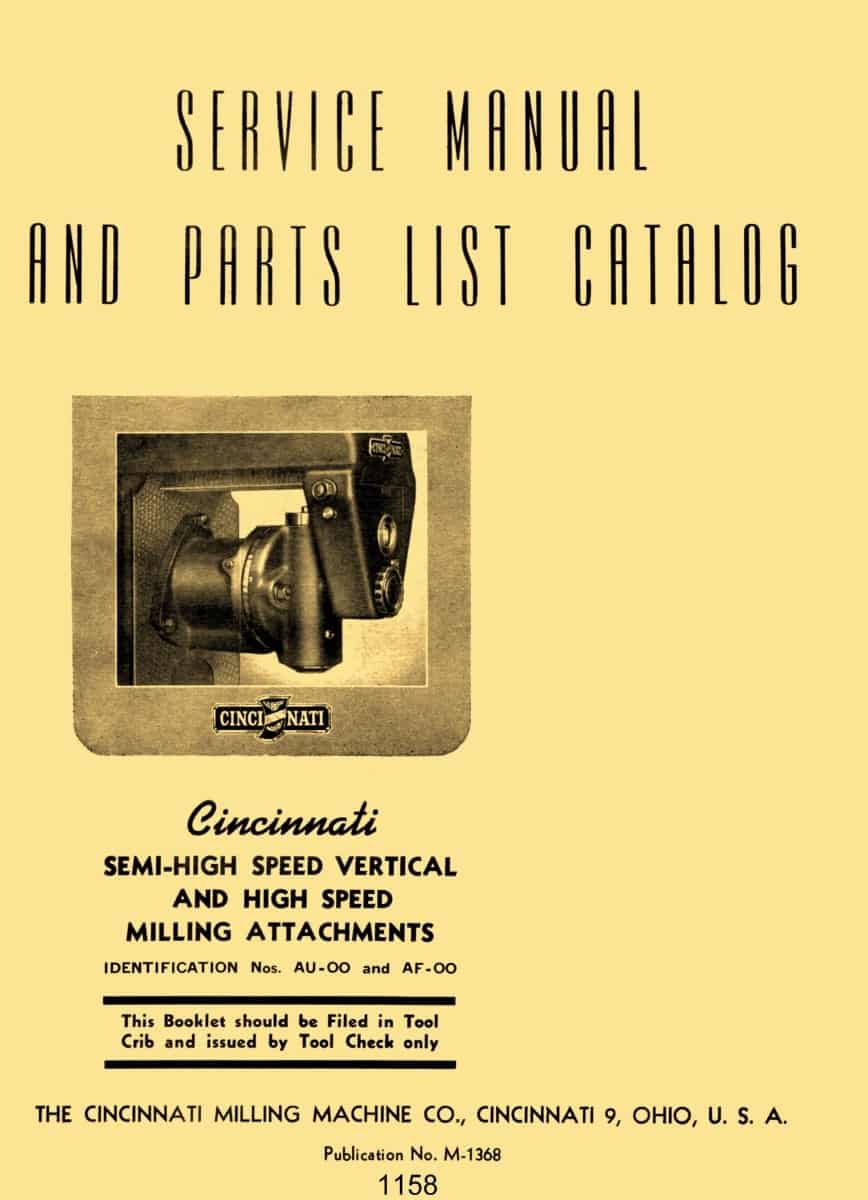 This is a reproduction, not a photocopy, of an original Cincinnati Semi-High Speed Vertical & High Speed Milling Machine Attachments Service & Parts Manual for all Cincinnati attachments whose serial number begins with “AF” or “AU”. This manual gives specifications of each type and size of Cincinnati semi-high speed vertical and high speed milling attachments in detail. The Cincinnati manual contains information on how to properly lubricate and install these milling attachments. This manual contains step-by-step instructions on how to dismantle various parts of these milling attachments, including the spindle. The manual covers adjustments, and contains a complete set of cross-sectional view diagrams of all the parts with descriptions for these Cincinnati semi-high speed vertical and high speed milling attachments.