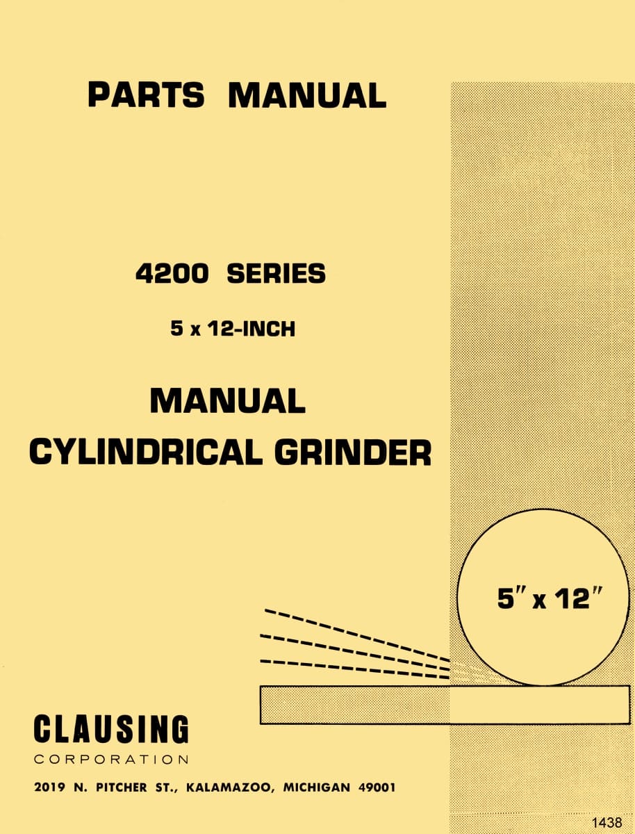 This is a reproduction, not a photocopy, of an original Clausing 5 x 12-inch Manual Cylindrical Grinder Parts Manual. This manual does not cover they hydraulic power feed version. This manual does include clear explosive view diagrams of the parts with parts descriptions.