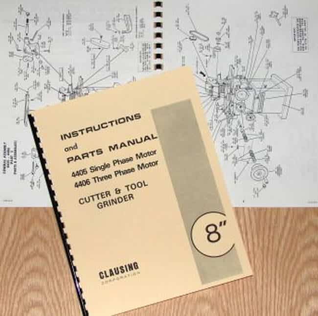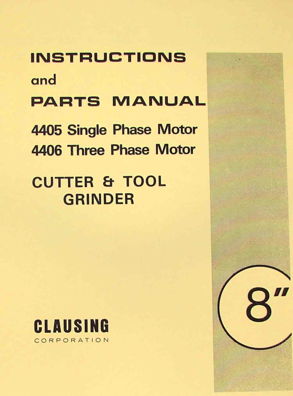 This is a reproduction, not a photocopy, of an original Clausing 8-inch 4405 & 4406 Cutter and Tool Grinder Instructions and Parts Manual. This machine was made by Covel and sold as a model 6A by them. This manual covers both the single and three phase motor types. It contains information on setup, adjustments, lubrication, maintenance, and controls as well as a complete parts list and exploded views.