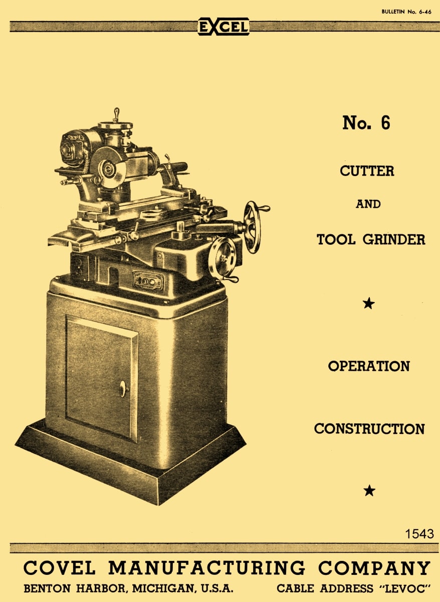This is a reproduction, not a photocopy, of an original Covel No. 6 Cutter and Tool Grinder Owner’s, Operator’s and Parts Manual. This manual contains the surface grinder specifications, operating instructions, and maintenance. This Covel manual also has proper lubrication instructions and it includes a complete set of clear cross-sectional view diagrams of the parts for these cutter and tool grinders.