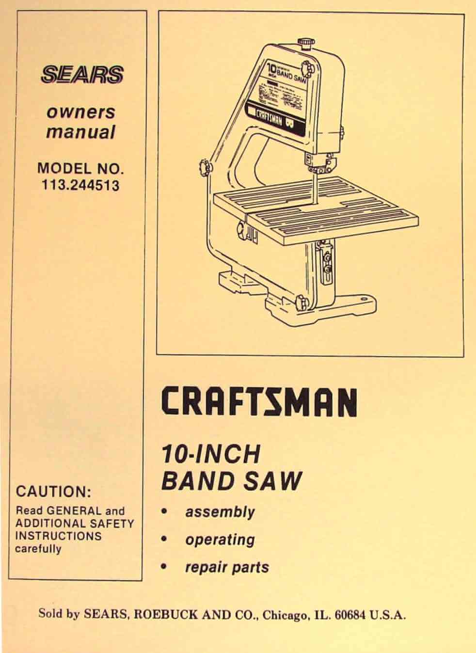 This is a reproduction, not a photocopy, of an original Craftsman 113.244513 10-inch Band Saw Instructions and Parts Manual. This manual contains general safety instructions, operation instructions, adjustments, maintenance, blade tension, and a complete set of exploded view part diagrams with descriptions.