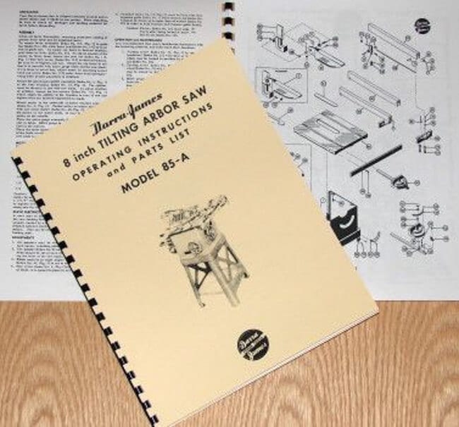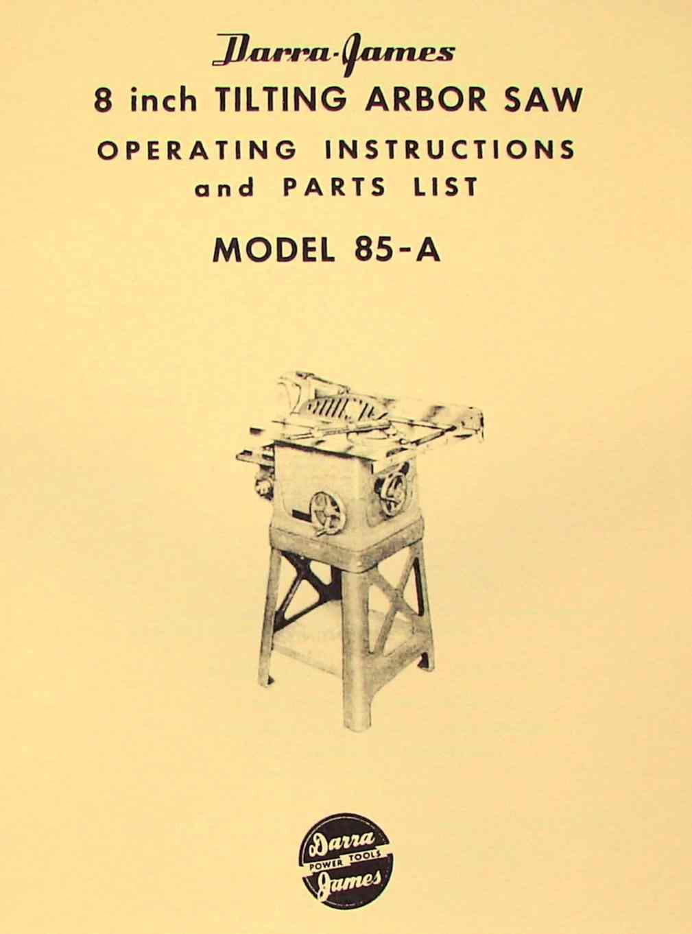 This is a reproduction, not a photocopy, of an original Darra-James 85-A 8″ Tilting Arbor Saw Operation and Parts Manual. This manual contains information on lubrication, maintenance, adjustments, and controls as well as a complete parts list and exploded views diagrams.