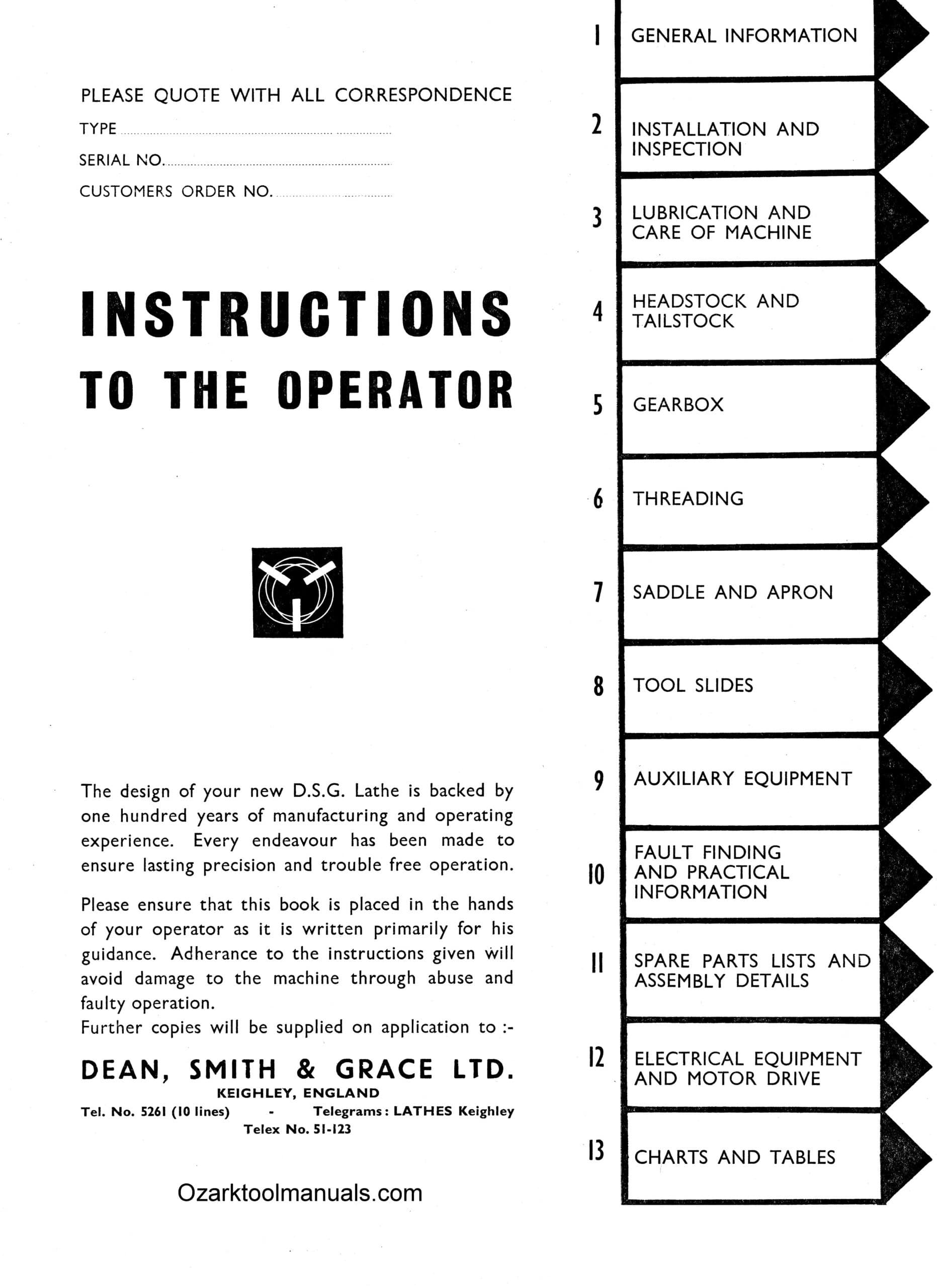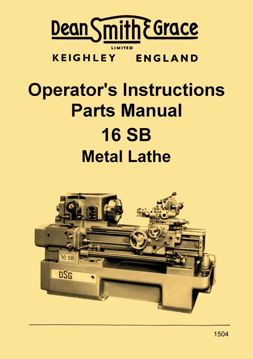 This is a reproduction, not a photocopy, of an original Dean Smith & Grace 16 SB Metal Lathe Operator’s Instructions and Parts Manual. This manual includes installation instructions with lifting and leveling instructions. It contains proper lubricating instructions and an oiling diagram. The has operating instructions with the different threading charts for the gearbox.