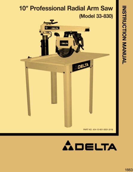 This is a reproduction, not a photocopy, of an original Delta 10″ Professional Radial Arm Saw Instructions and Parts Manual for model 33-830. This manual contains information on assembly instructions, electrical requirements, maintenance, adjustments, and proper operating instructions. The manual has detailed instructions with pictures on how to make square and true cuts. It shows how to properly align the fence, arm, and table. It also contains a complete set of clear exploded view diagrams of all the parts with parts list and descriptions for this Delta 33-830 radial arm saw.