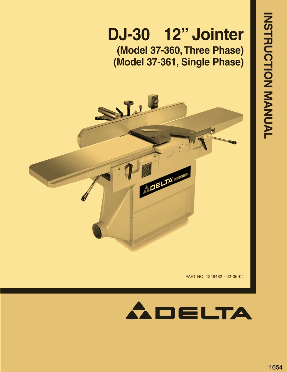 This is a reproduction, not a photocopy, of a Delta DJ-30 12″ Industrial Jointer Instruction and Parts Manual for models 37-360 and 37-361. This manual contains information on installation, assembling, adjusting instructions, replacing the knives, and proper operating instructions. It also has a complete set of clear exploded view diagrams of all the parts with parts list and descriptions for these Delta jointers.