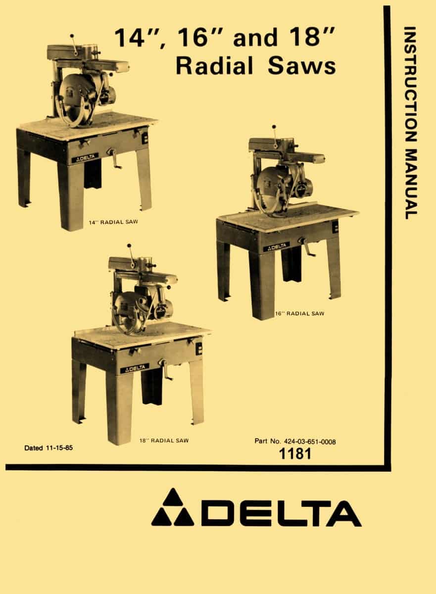 This is a reproduction, not a photocopy, of an original Delta 14″, 16″, and 18″ Radial Arm Saw Instructions and Parts Manual. This manual covers quite a few models including the 33-081, 33-082, 33-083, 33-071, 33-072, 33-073, 33-061, 33-062, and 33-063. This manual contains information on electrical, maintenance, adjustments, squaring blade with the table and fence, operations, and controls. It also contains exploded view diagrams of all the parts for the machine.