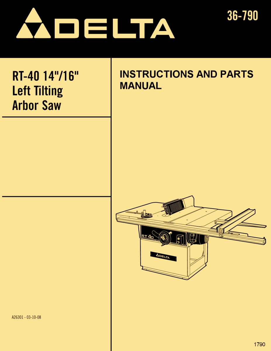 This is a reproduction, not a photocopy, of an original Delta 14″ and 16″ Left Tilting Arbor Table Saw Operating Instructions and Parts Manual for model RT-40. This manual contains information on properly assembling and installing this saw in your shop. There are several pages, with pictures, on adjustments, maintenance, and proper operating instructions. The manual also has a complete set of clear exploded view diagrams of all the parts with parts lists and descriptions for this Delta table saw.