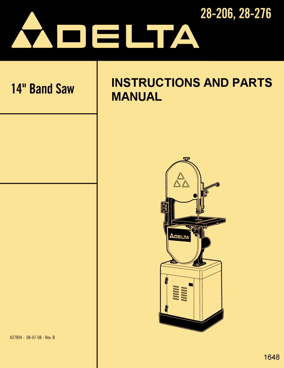 DELTA 14″ Band Saw 28-206 28-276 Owner Instructions Service Parts Manual