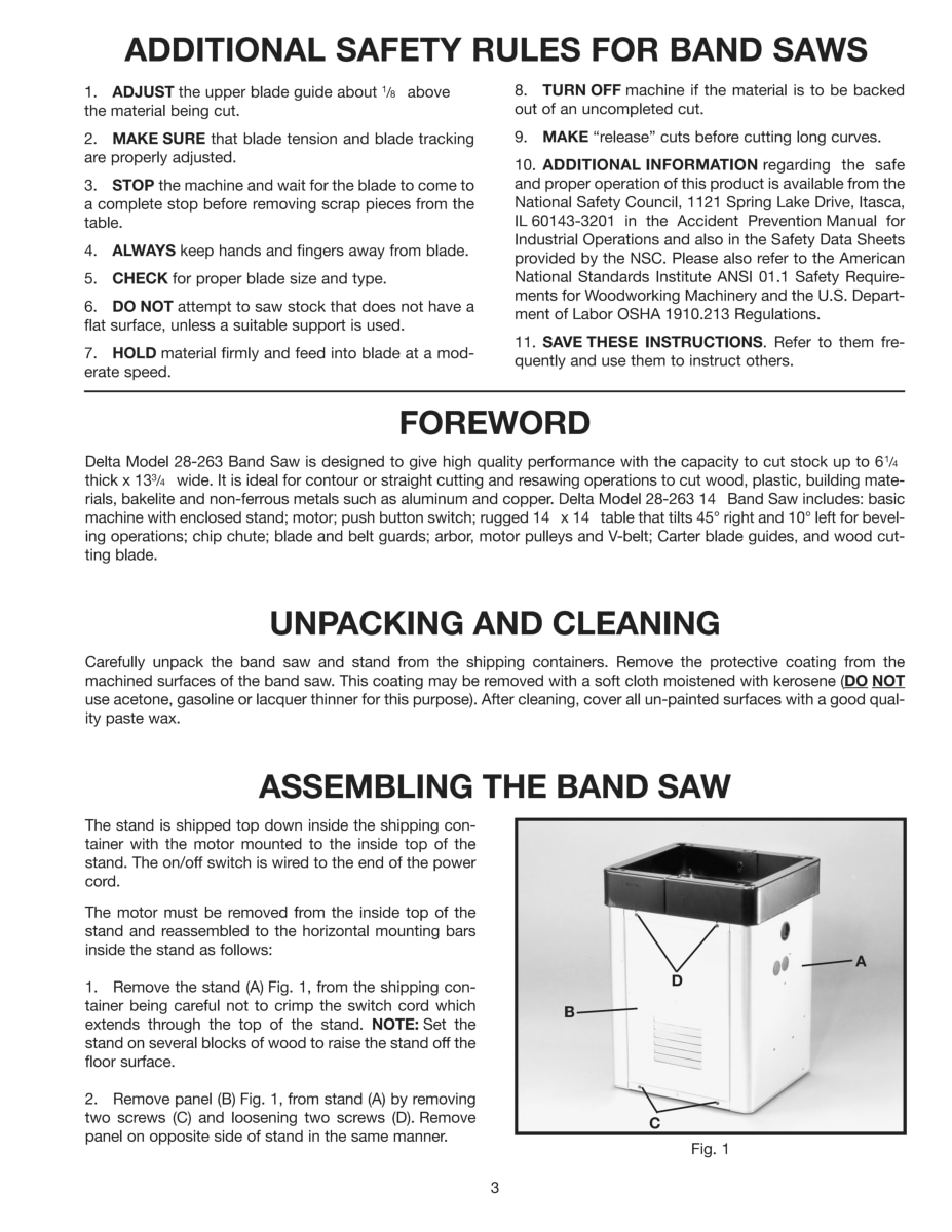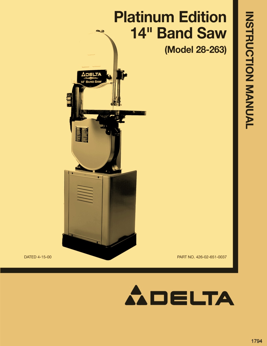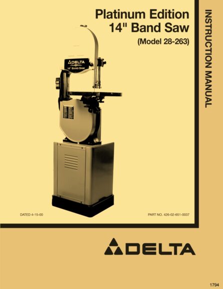 This is a reproduction, not a photocopy, of an original Delta 14″ Platinum Edition Wood Band Saw Model 28-263 Instructions and Parts Manual. This manual contains information on how to properly setup this band saw and operate it. The manual covers how to correctly adjust the guides and wheels to track the blade correctly. It also contains clear explosive view diagrams of all the parts with parts lists and descriptions for these Delta band saws.