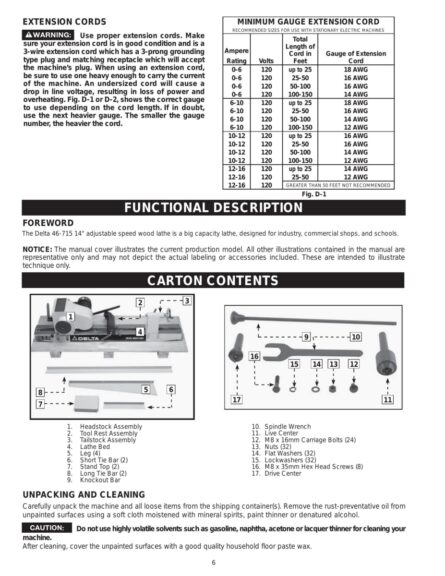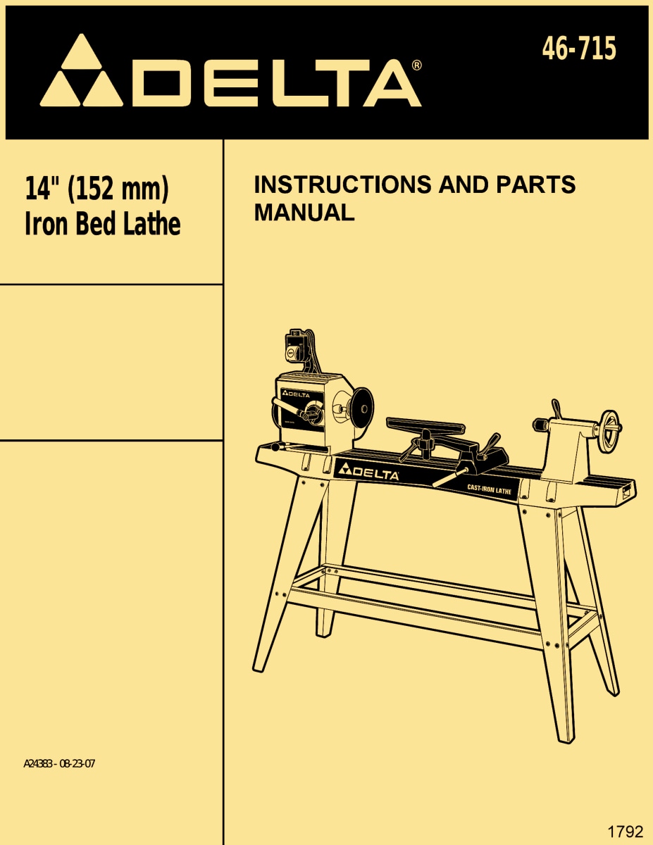 This is a reproduction, not a photocopy, of an original Delta Models 46-715 14-inch Variable Speed Wood Lathe instructions and parts manual. This manual contains information about how to assemble and set up this lathe. It covers how to change speeds and operating instructions, as well as maintenance and lubrication instructions. Instructions for aligning the headstock. It also contains clear explosive view diagrams of all the parts with parts lists and descriptions.