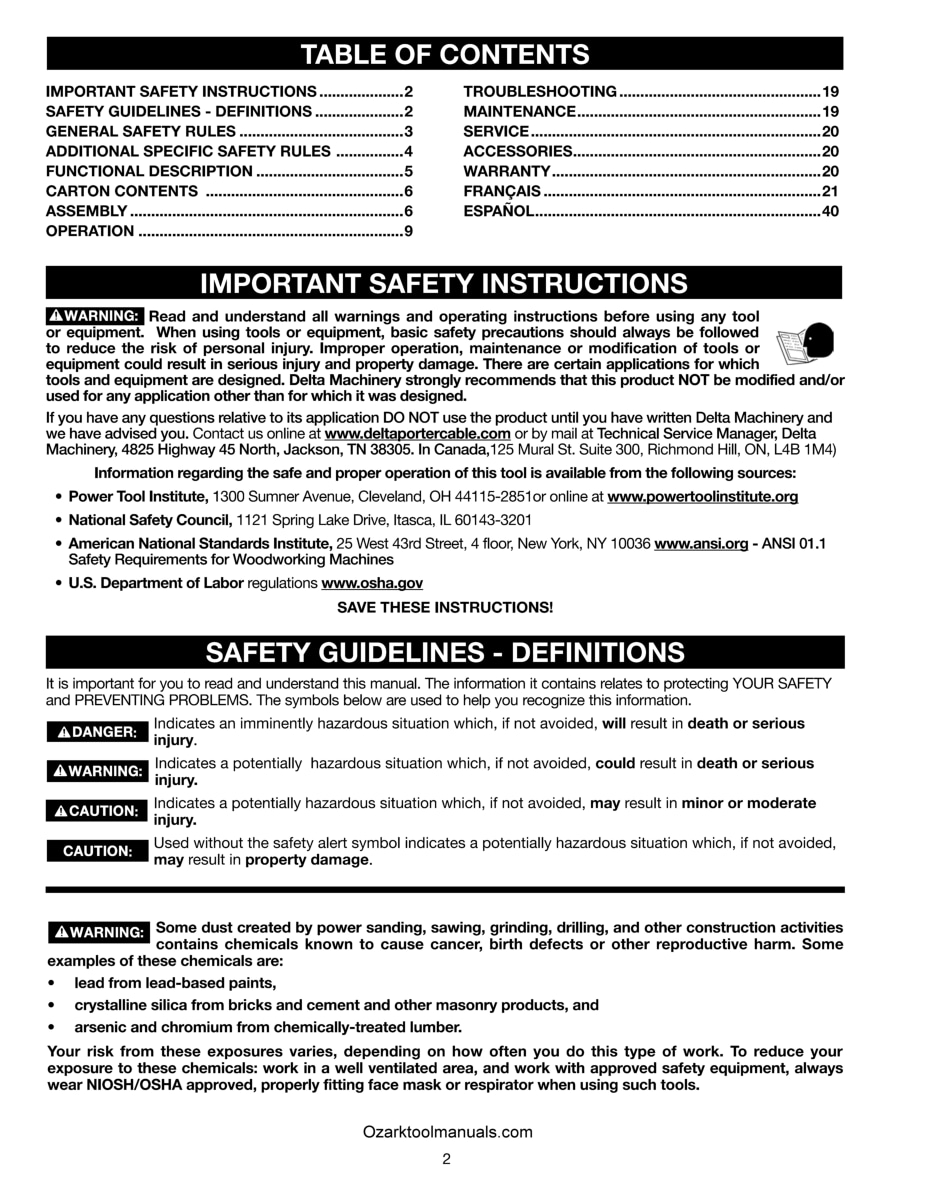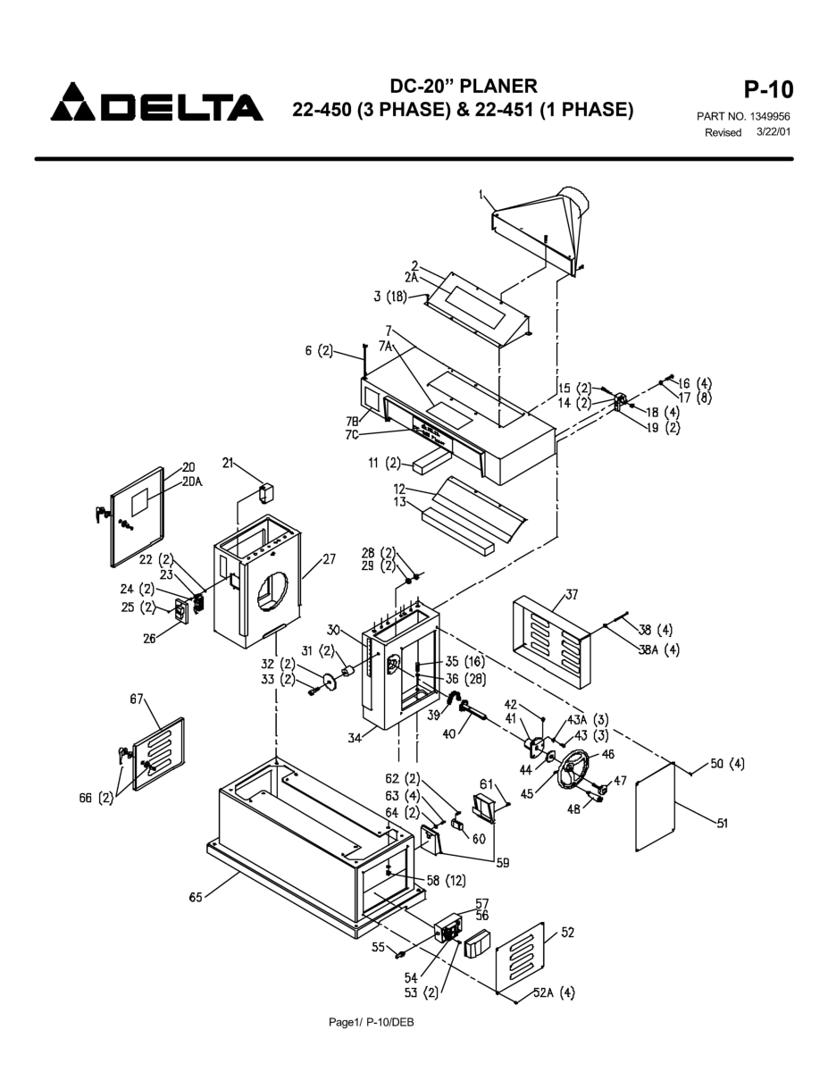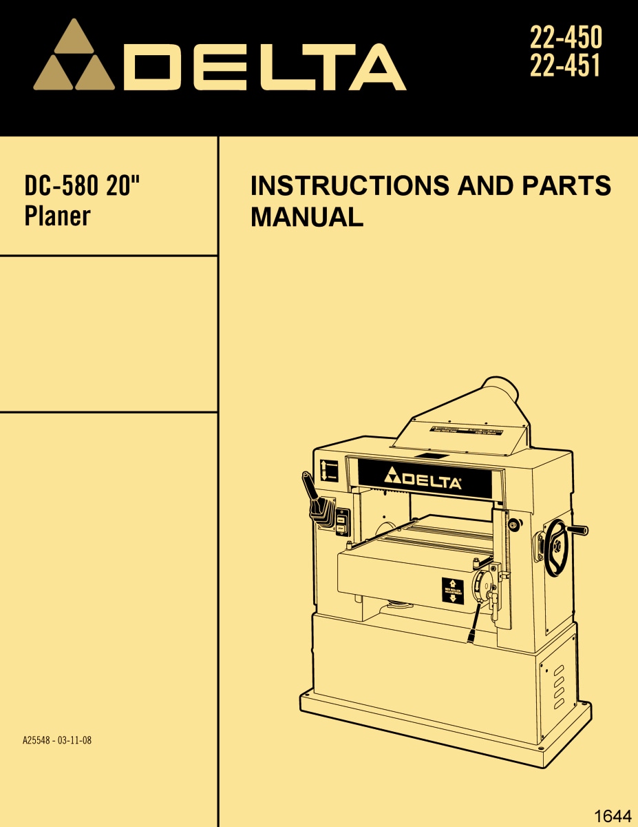 Delta DC-580 20″ Wood Planer 22-450, 22-451 Owner’s Instruction Service Parts Manual