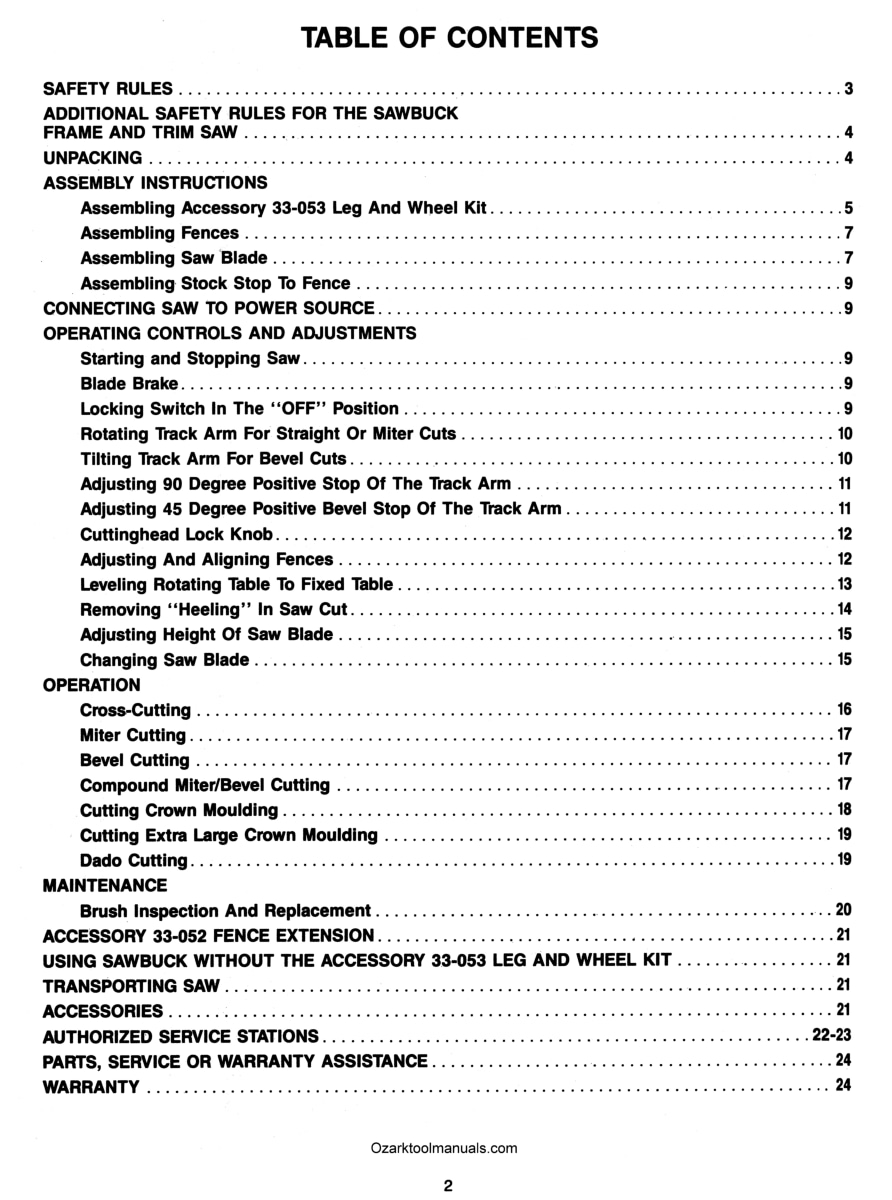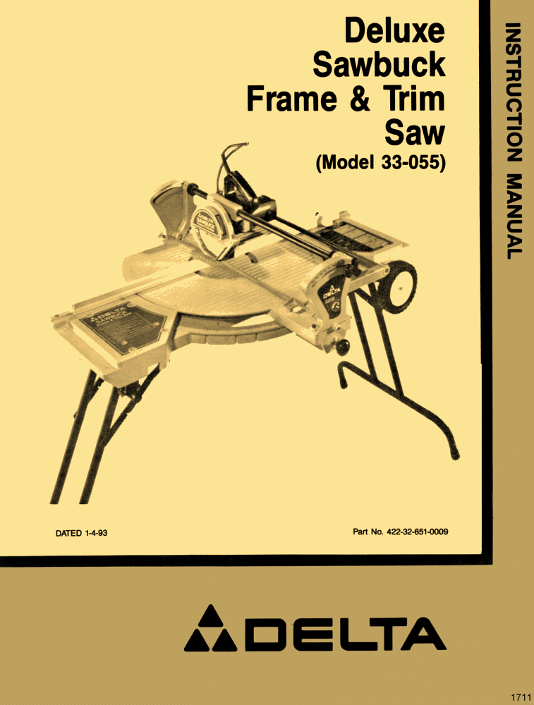 This is a reproduction, not a photocopy, of an original Delta Deluxe Sawbuck Frame & Trim Saw Model 33-055 Instructions and Parts Manual. This manual contains information on assembling instructions, operating instructions, adjustments, helpful tips, instructions on removing “heeling” in the saw, and aligning and leveling the rotating table to the fixed table. There is also a complete set of exploded view diagrams of all the parts with descriptions.