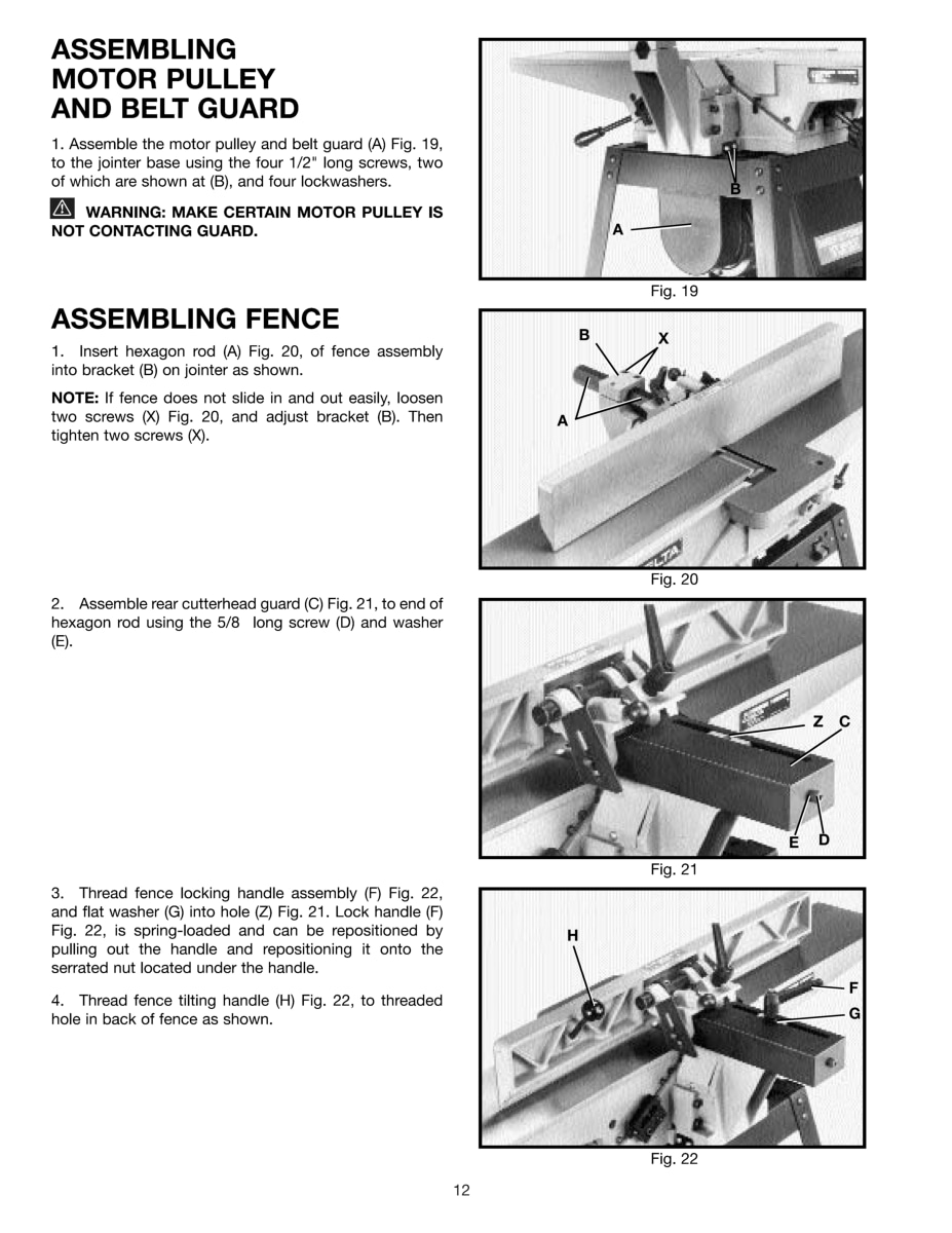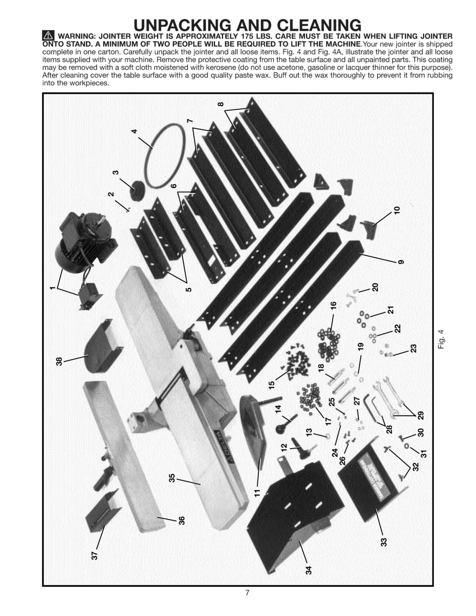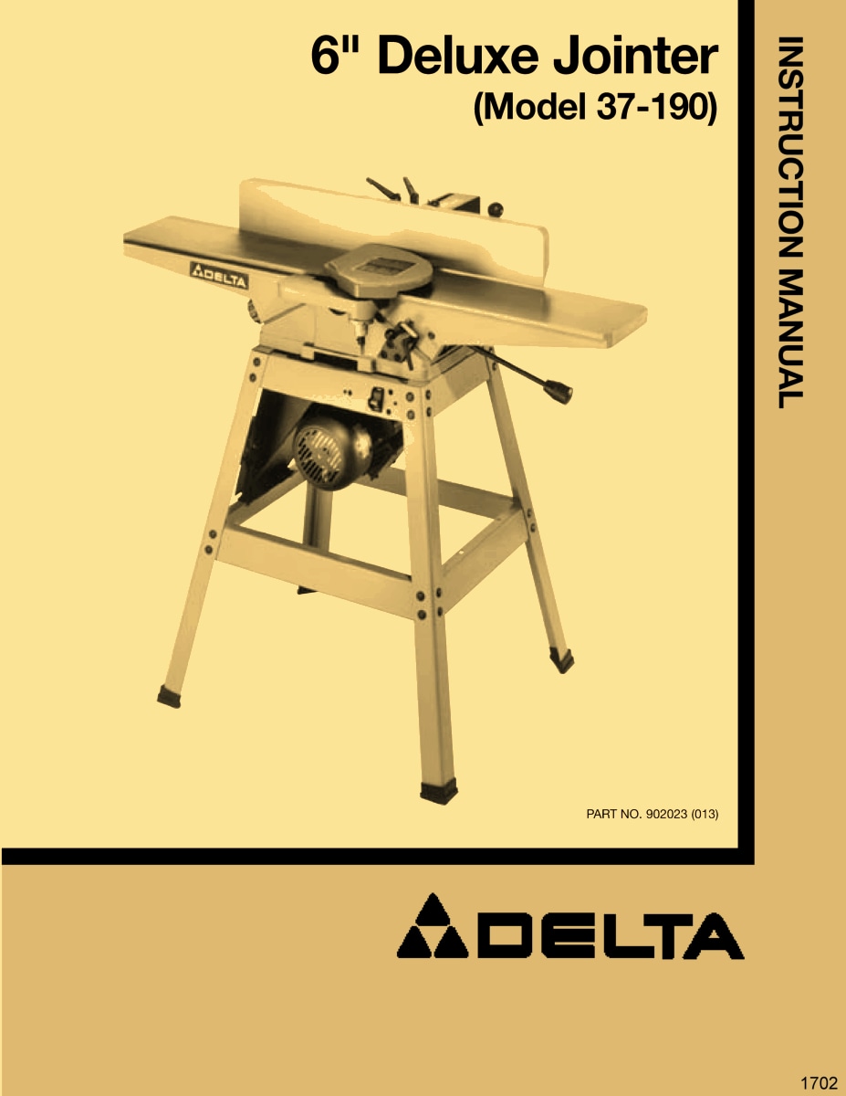 This is a reproduction, not a photocopy, of a Delta 6″ Deluxe Jointer Instruction and Parts Manual for model 37-190. This manual contains information on installation, assembling, adjusting instructions, replacing and setting the jointer knives, and proper operating instructions. It also has a complete set of clear exploded view diagrams of all the parts with parts list and descriptions for this Delta jointer.