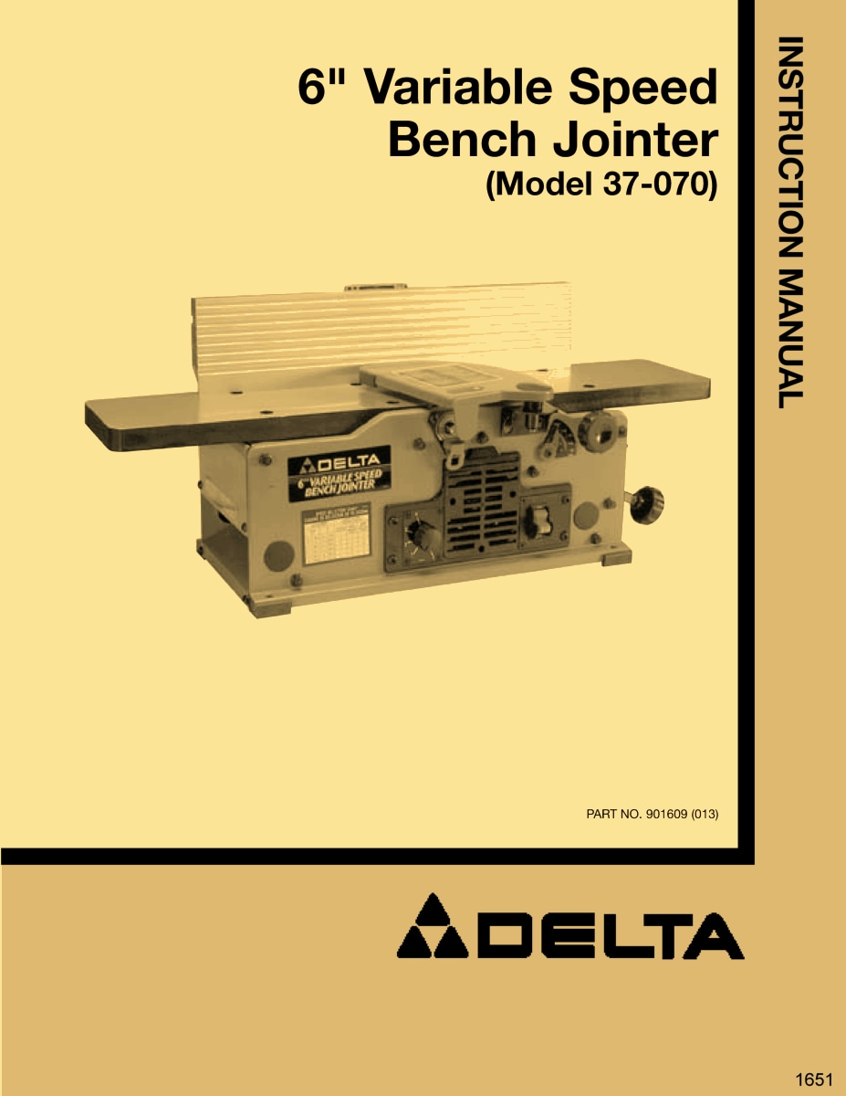 This is a reproduction, not a photocopy, of a Delta 6″ Variable Speed Bench Jointer 37-070 Instruction and Parts Manual. This manual contains information on installation, assembling, adjusting instructions, replacing the knives, and proper operating instructions. It also has a complete set of clear exploded view diagrams of all the parts with parts list and descriptions for this Delta 37-070 jointer.