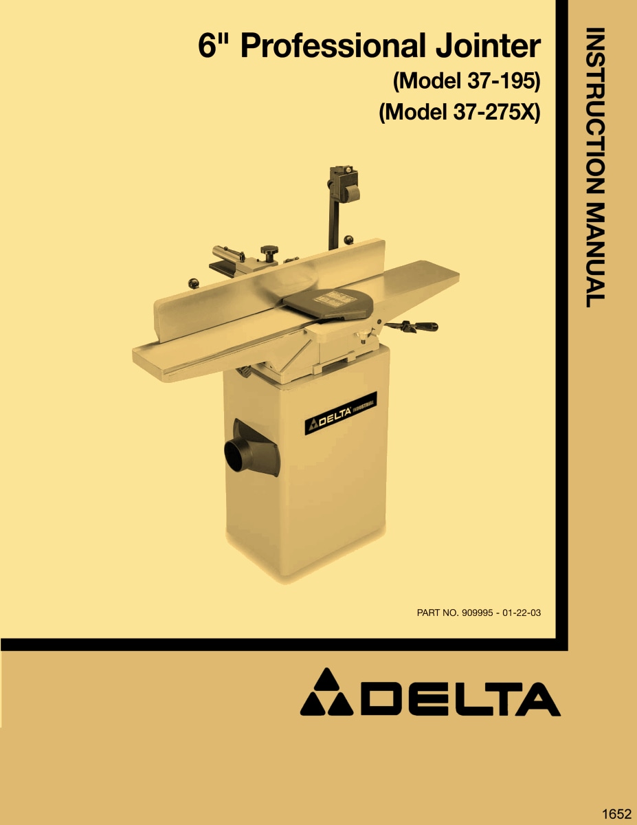 This is a reproduction, not a photocopy, of a Delta 6″ Professional Jointer Instruction and Parts Manual for models 37-195 and 37-275X. This manual contains information on installation, assembling, adjusting instructions, replacing the knives, and proper operating instructions. It also has a complete set of clear exploded view diagrams of all the parts with parts list and descriptions for these Delta jointers.