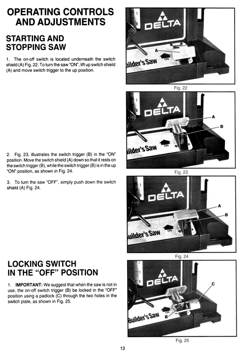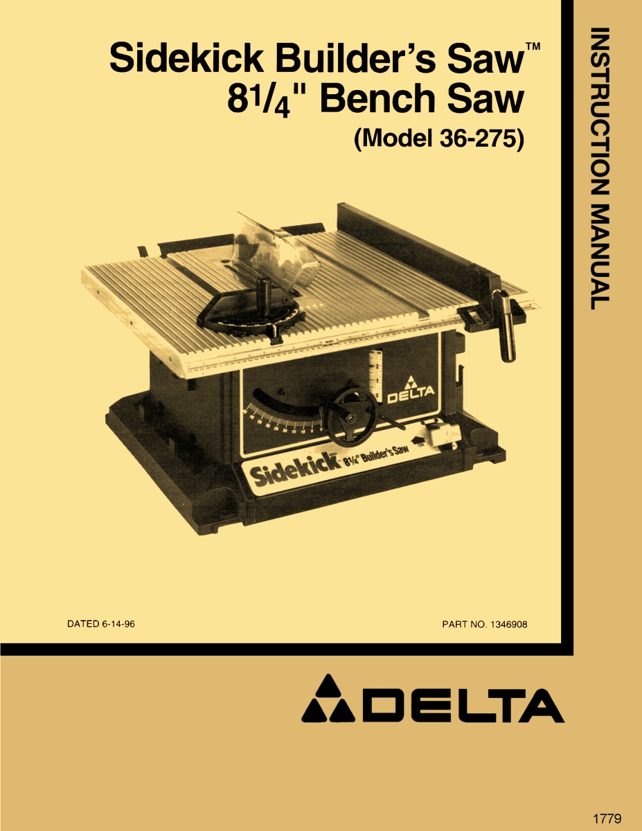 This is a reproduction, not a photocopy, of an original Delta 8 1/4″ Sidekick Builder’s Circular Bench Saw Operating Instructions and Parts Manual for model 36-275. This manual contains information on assembling, adjustments, maintenance, and proper operating instructions. There is also a complete set of explosive view diagrams of all the parts with parts lists and descriptions.