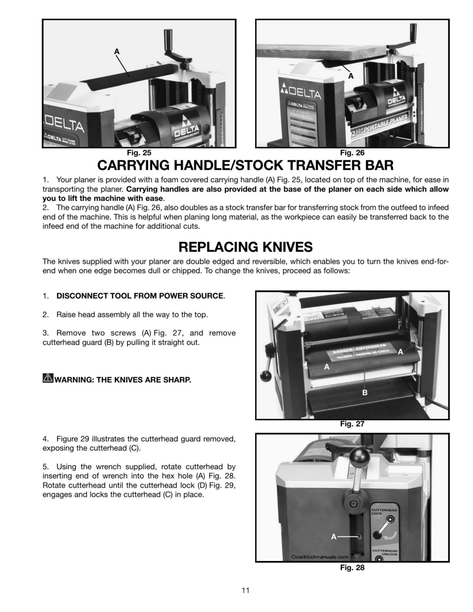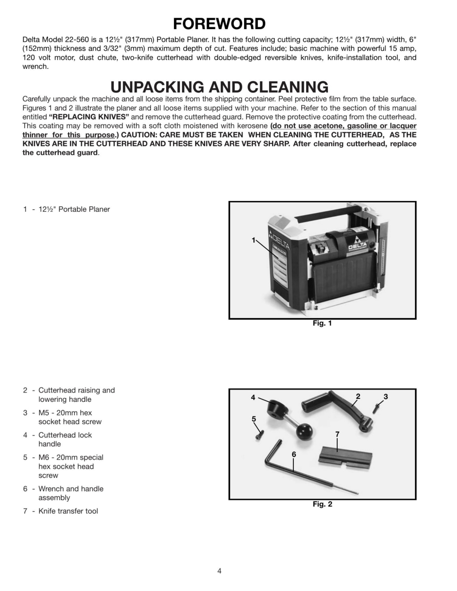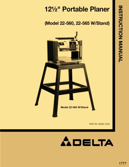 This is a reproduction, not a photocopy, of an original Delta Industrial Benchtop 12 1/2″ Portable Wood Planer Instruction and Parts Manual for models 22-560 and 22-565 with the stand. This manual contains information on setting up and assembling the planer, and proper operating procedures of all the features for this planer. It covers how to adjust and replace knives, and how to adjust the feed rollers. The manual includes proper lubrication instructions, and it comes with a complete set of exploded view diagrams of all the parts with parts lists and descriptions for these Delta 22-560 and 22-565 Planers.