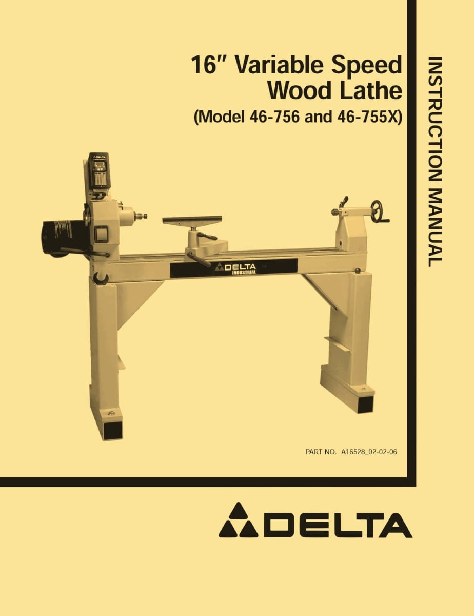 This is a reproduction, not a photocopy, of an original Delta Models 46-756 and 46-755X 16 inch variable speed wood lathe instructions and parts manual. This manual contains information about how to assemble and set up this lathe. It covers how to change speeds and operating instructions as well as maintenance and lubrication instructions. It also contains explosive view diagrams of all the parts with parts list and descriptions.