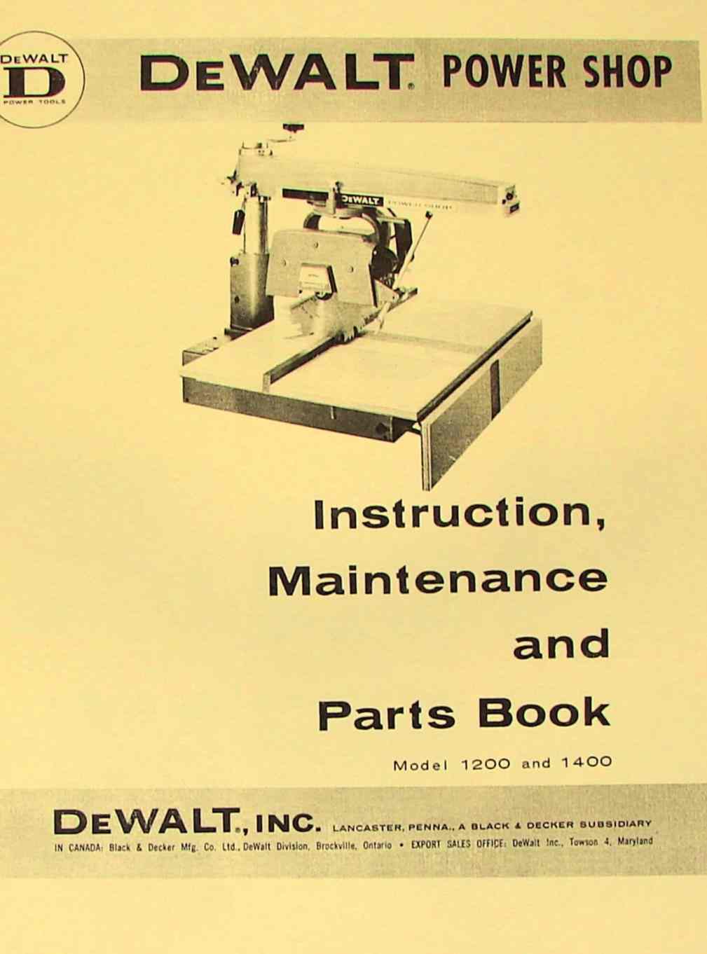 This is a reproduction, not a photocopy, of an original Dewalt Power Shop 1200 and 1400 Radial Arm Saw Instruction and Parts Manual. This manual contains information on setting up the saw, operating it, different methods of cutting, adjustments, alignments, wiring, and maintenance. It also contains exploded view parts diagrams with parts list.