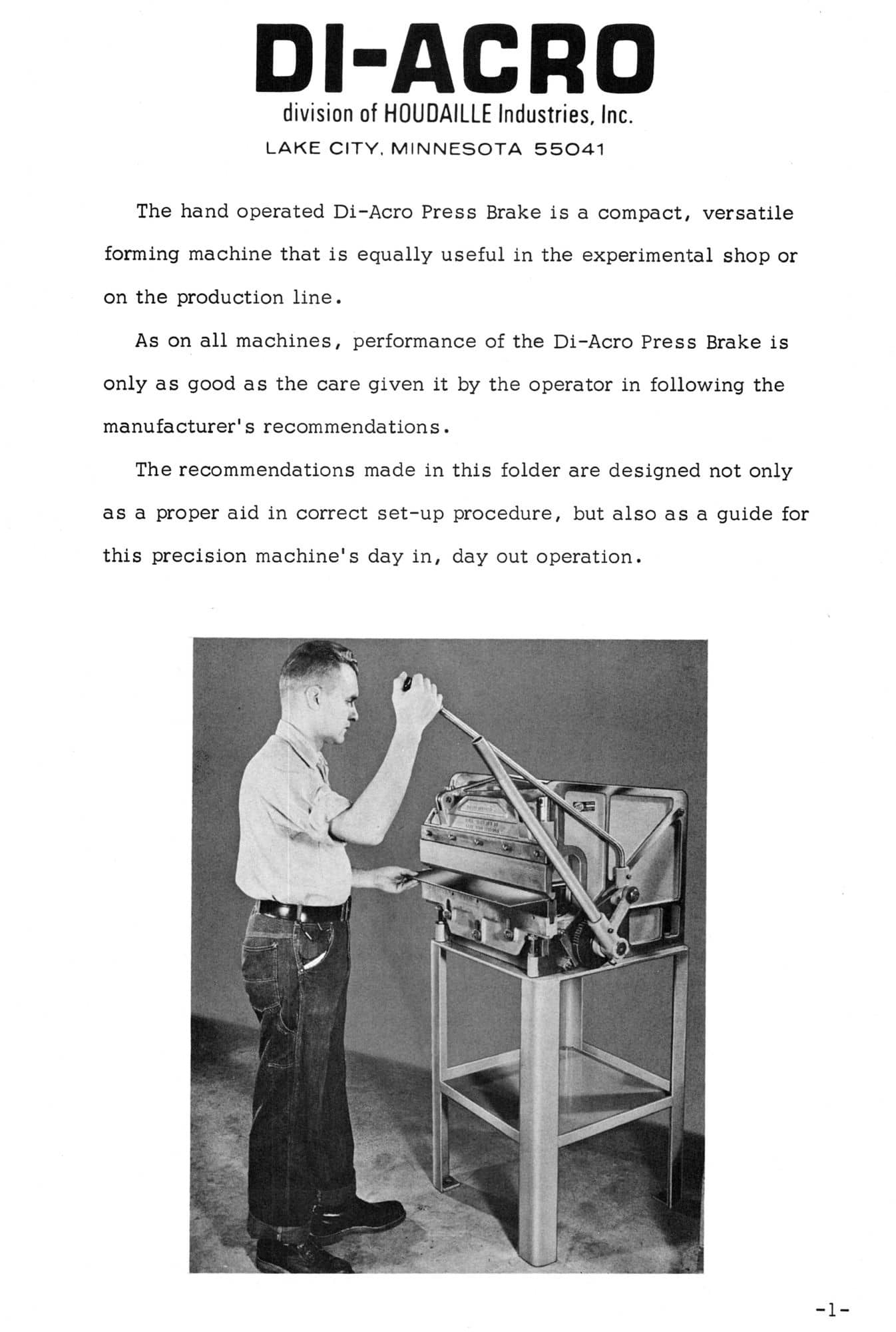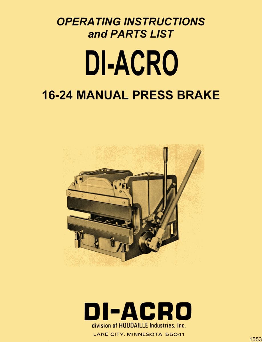 This is a reproduction, not a photocopy, of an original Di-Acro 16-24 Manual Hand Press Brake Instructions and Parts Manual. This manual contains information on installation, lubrication, making adjustments, operating instructions, installing and adjusting dies and pictures of the parts with part numbers and descriptions.