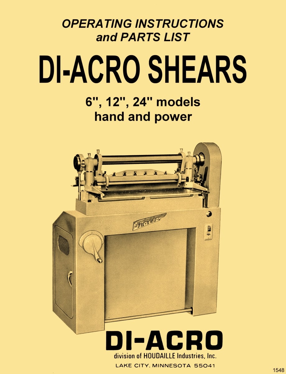 This is a reproduction, not a photocopy, of an original Di-Acro 6″, 12″, 24″ Hand and Vari-O-Speed Power Shear No. 24 Instructions and Parts Manual. This manual contains information on installation, lubrication, making adjustments, shear blade sharpening, operating instructions, and pictures of the parts with part numbers and descriptions. The manual explains how to adjust the clutch properly on these shears as well.