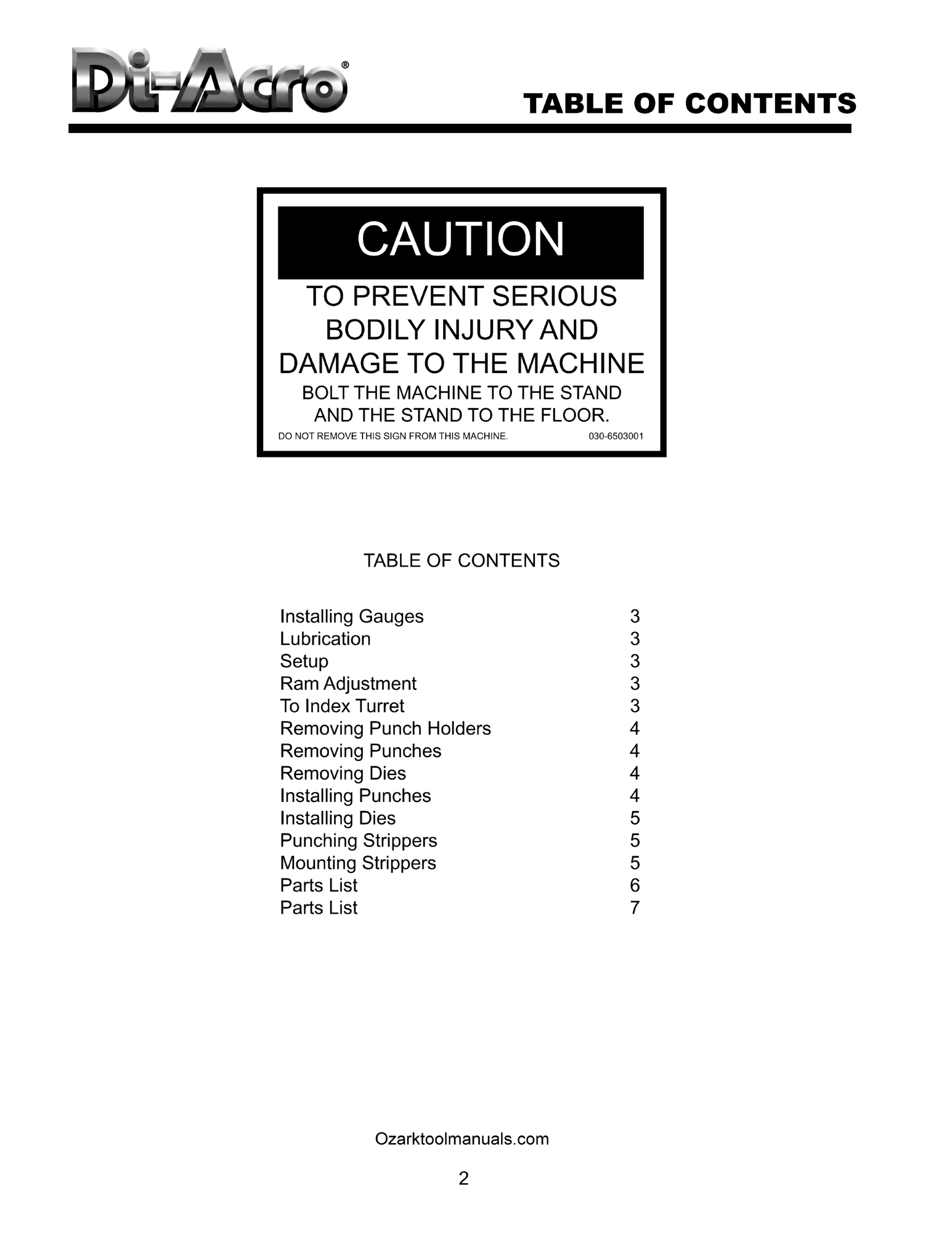 This is a reproduction, not a photocopy, of an original Di-Acro No. 12 & 18 Hand Operated Turret Punch Press Instructions and Parts Manual. This manual contains information on installation, lubrication, making adjustments, installing dies, mounting strippers, operating instructions, and pictures of the parts with part numbers and descriptions.