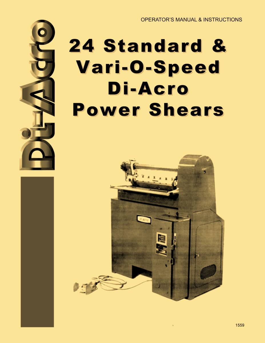 This is a reproduction, not a photocopy, of an original Di-Acro Hand and Vari-O-Speed Power Shear No. 24 Instructions and Parts Manual. This manual contains information on installation, lubrication, making adjustments, and operating procedures. There are also a set of explosive view diagrams of the parts with parts list and descriptions.