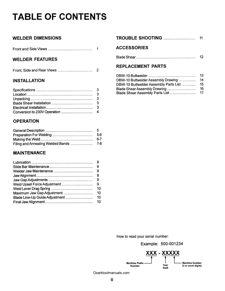 This is a reproduction, not a photocopy, of an original DoAll Automatic Butt Welder Model DBW-10 Operations and Parts Manual. This manual is for DBW-10 models with serial numbers 479-89101 and higher. This manual contains information on setting up and properly operating this butt welder. It also contains the part and wiring diagrams.