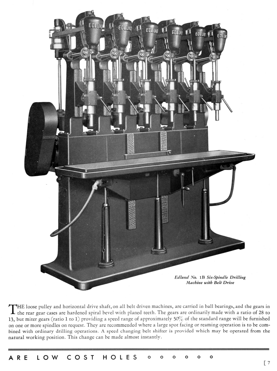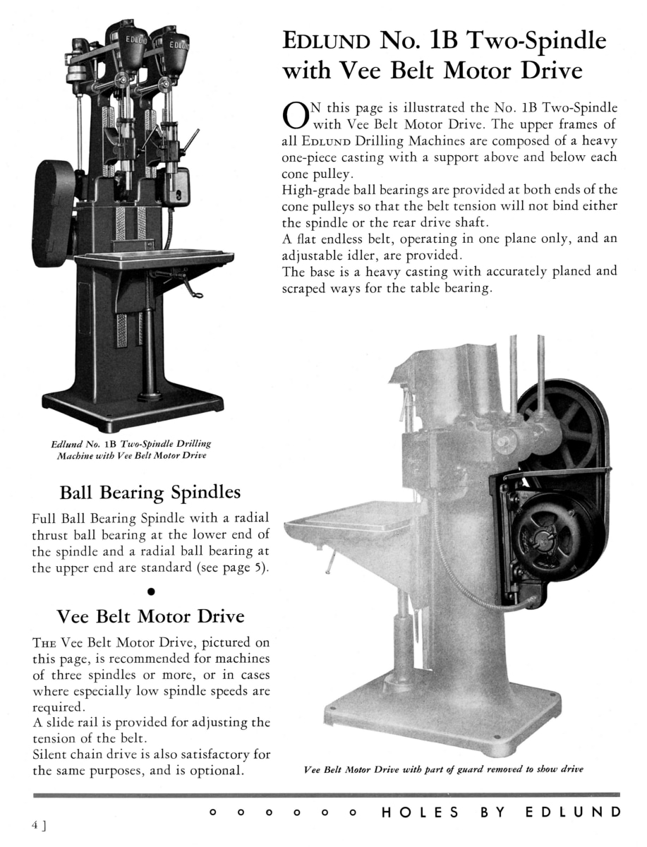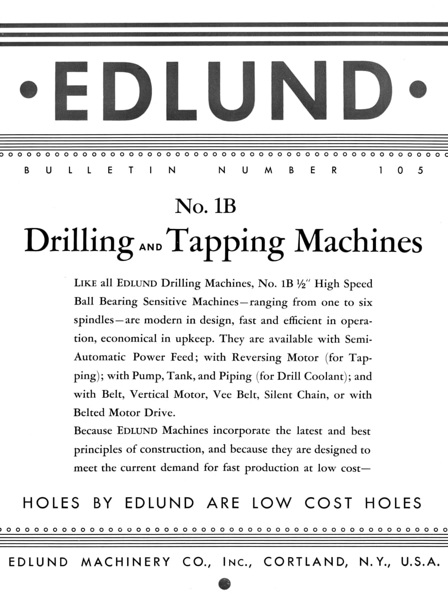 This is a reproduction, not a photocopy, of an original Edlund No. 1B-7″ and 1B-12″ Sensitive Drill Press and Tapping Machines Parts Manual with extra sales literature. This manual has detailed cross-sectional schematics and parts diagrams with parts lists that identify every internal component from the cone pulleys to the spindle sleeves. We added an 8-page sales bulletin that was included with the manual. This Edlund bulletin includes pictures of the machines and optional accessories like, No. 10 Semi-Automatic Power Feed, the reversing motor, pump, tank and piping for the vertical motor drive, the ball bearing motor drive, and all the drill and tapping machine specifications for the different models available. The bulletin provides the pulley size and motor speed chart as well. It explains the different RPM options.